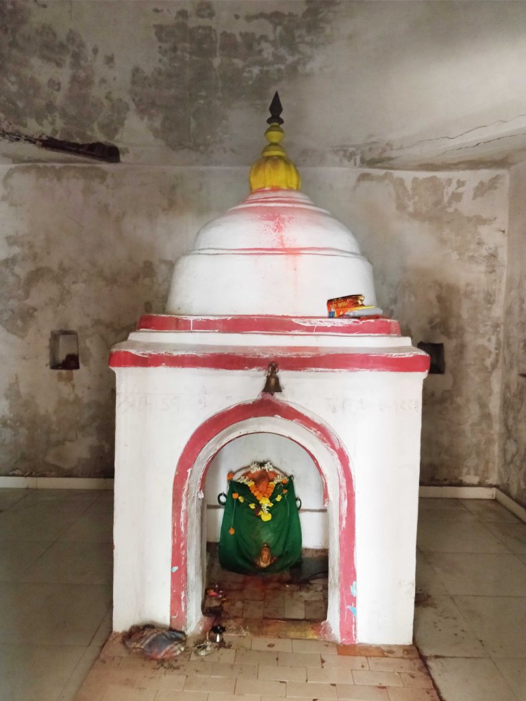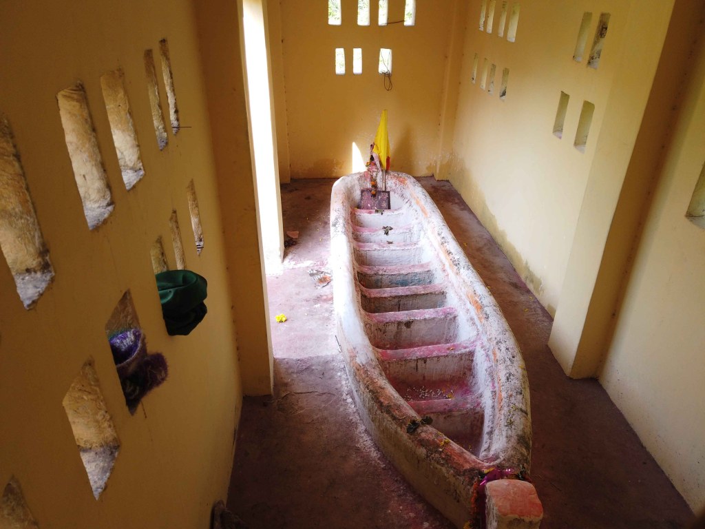 मंदिरामध्ये असलेल्या देवीच्या मूर्तीबरोबरच तिथं असलेल्या दगडी होडीचीही पूजा केली जाते. अशी आख्यायिका आहे की या दगडी होडीत बसून पाच पांडव आवासजवळ आले आणि एका रात्रीत विविध मंदिरे निर्माण करून तिथं प्रतिकाशी वसवण्याचा प्रयत्न केला. देवीला हे पटले नाही आणि मग तिने कोंबड्याचे रूप धारण केले. कोंबडा आरवला म्हणजे सकाळ झाली असे समजून पांडवांनी काम थांबवले पण त्यांच्या लक्षात आले की आपली फसवणूक झाली आहे. चिडलेल्या भीमाने देवीच्या श्रीमुखात ठेवून दिले आणि त्यामुळे देवीचे तोंड वाकडे झाले अशी समजूत आहे.