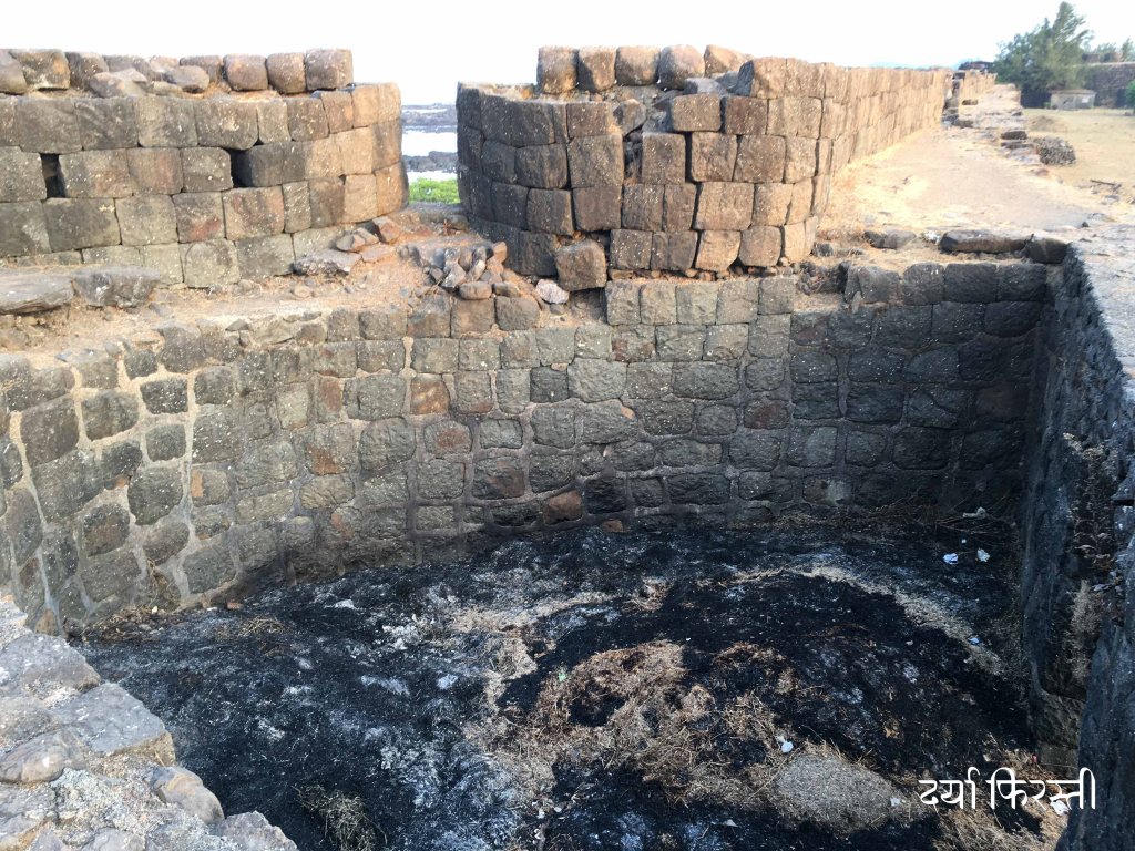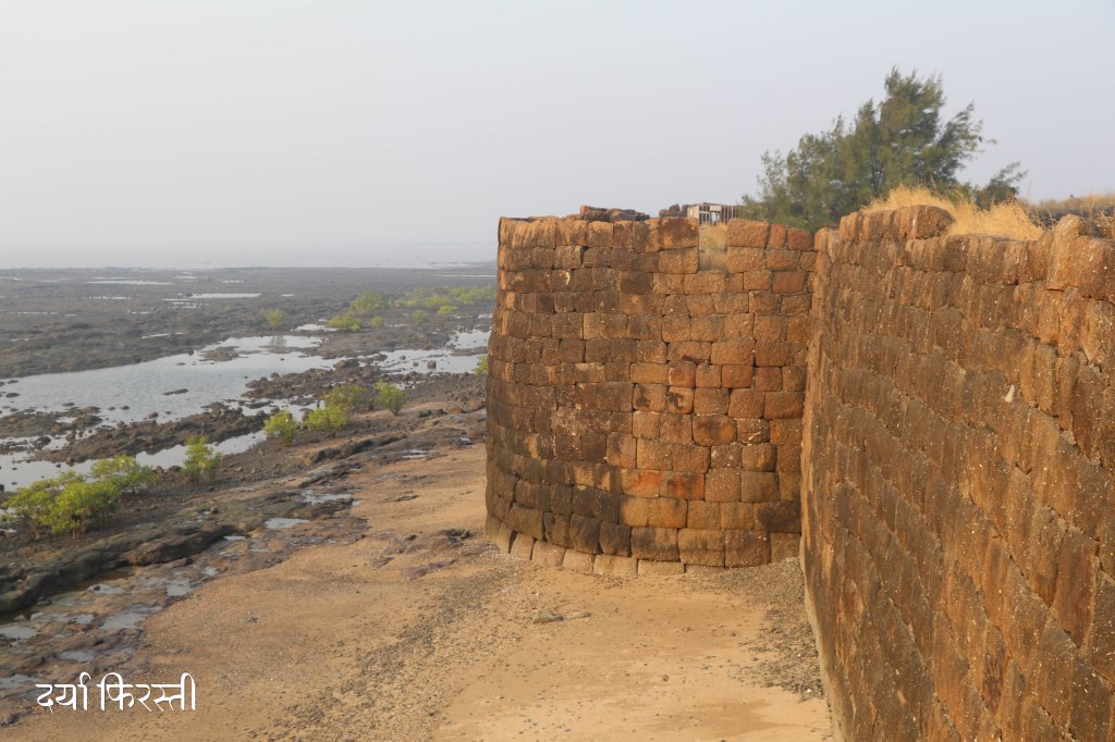 किनाऱ्याला समांतर अशी उत्तर दक्षिण पसरलेली तटबंदी पाहत आपण पुढं जातो. इथं संरक्षक बुरुजांची एक विशिष्ट रचना आपल्याला दिसून येते. बुरुज आतल्या बाजूने एका अर्ध वर्तुळाकार भिंतीने संरक्षित केलेला दिसतो आणि या भिंतीत असलेले दरवाजे बुरुजाकडे एका खोलगट भागात घेऊन जातात. ही रचना कदाचित संरक्षक सैन्याला दारूगोळा, हत्यारे पुरवण्यासाठी असू शकेल. पण तज्ज्ञच यामागचे कारण स्पष्ट सांगू शकतील.