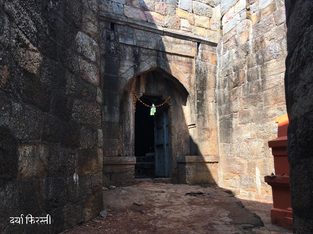 किल्ल्याजवळ पोहोचलो की गोमुख बांधणीच्या महादरवाजाचे दर्शन होते. अगदी जवळ पोहोचेपर्यंत आपल्याला दार दिसत नाही. महादरवाजावर आता द्वारशिल्पे नाहीत. पण चौकट आणि महिरपी कमानीचे सौंदर्य खुलून दिसते. गोमुख बांधणीचे दरवाजे हे शिवकालीन दुर्गबांधणीचे वैशिष्ट्य. महाराज सांगतात –