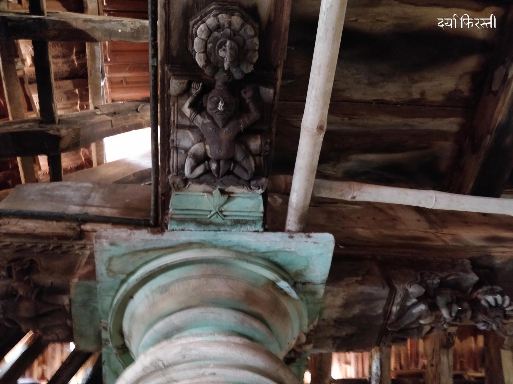 पण या मंदिराचे अगदी विशेष सौंदर्यस्थान आहे इथले लाकडी कोरीवकाम. एकही खिळा न ठोकता, एकमेकांमध्ये अडकणारे लाकडी भाग बनवून हे बांधकाम केले आहे. इथल्या स्तंभांवर सुरेख कोरीवकाम आहे. मंदिर शंकराचे आहे परंतु दशावतार कोरलेले दिसतात. कदाचित इथं निधी देणारा शासक वैष्णव असेल, किंवा पूर्वी शैव-वैष्णव भेद तितका टोकदार झालेला नसेलही. मला तज्ज्ञांचा अभिप्राय जाणून घ्यायला आवडेल.