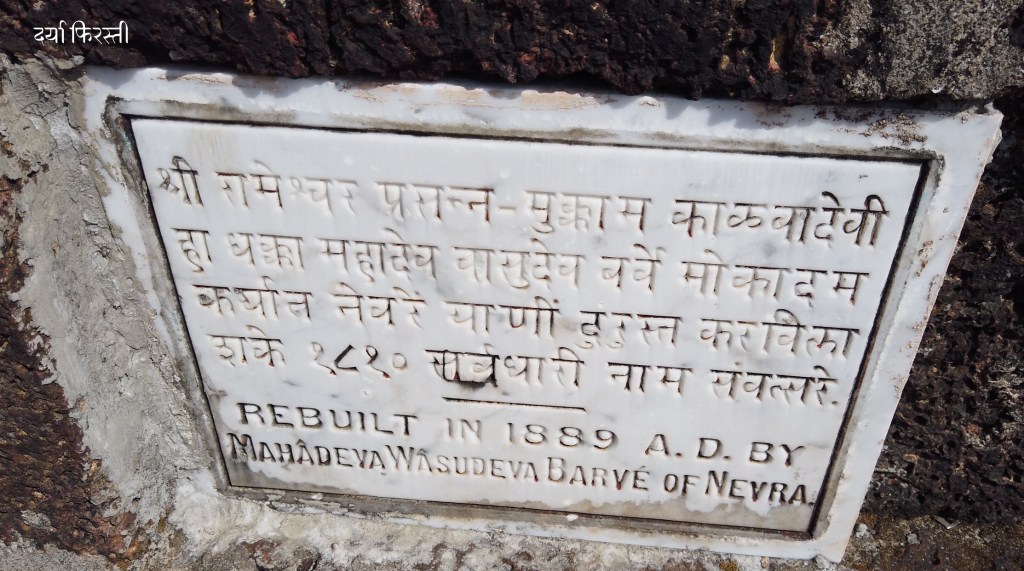 या मंदिराची दुरुस्ती नेवरे येथील मुकादम महादेव वासुदेव बरवे यांनी शके १८१० म्हणजे १८८९ साली केली असा कोरीव लेख इथं लावलेला दिसला. माझा लहानपणापासूनचा मित्र सुशांत प्रकाश बरवे हा नेवरे गावचा असल्याने मी त्याच्या वडिलांना याबद्दल विचारले.. ते त्यांच्या आजोबांचे आजोबा निघाले. भ्रमंती करत असताना अशा गोष्टी अचानकपणे गवसणे खरंच मजेची गोष्ट आहे.