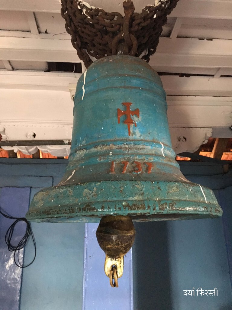 या देवळात एक पोर्तुगीज घंटा आहे. स्थानिकांच्या मते या घंटेचे वजन ५०० किलो आहे आणि तिचा आवाज अनेक किलोमीटर दूर ऐकू जातो. या घंटेवर क्रूस आणि १७३७ साल कोरलेले दिसते. सांगलीचे सरदार पटवर्धन यांनी विसाजीपंत लेल्यांच्या मार्फत ही पोर्तुगीज घंटा उंटावरून इथं पाठवली अशी नोंद इतिहासकारांना सापडली. अशा पोर्तुगीज घंटा महाराष्ट्रात ५० ठिकाणी तरी असतील.