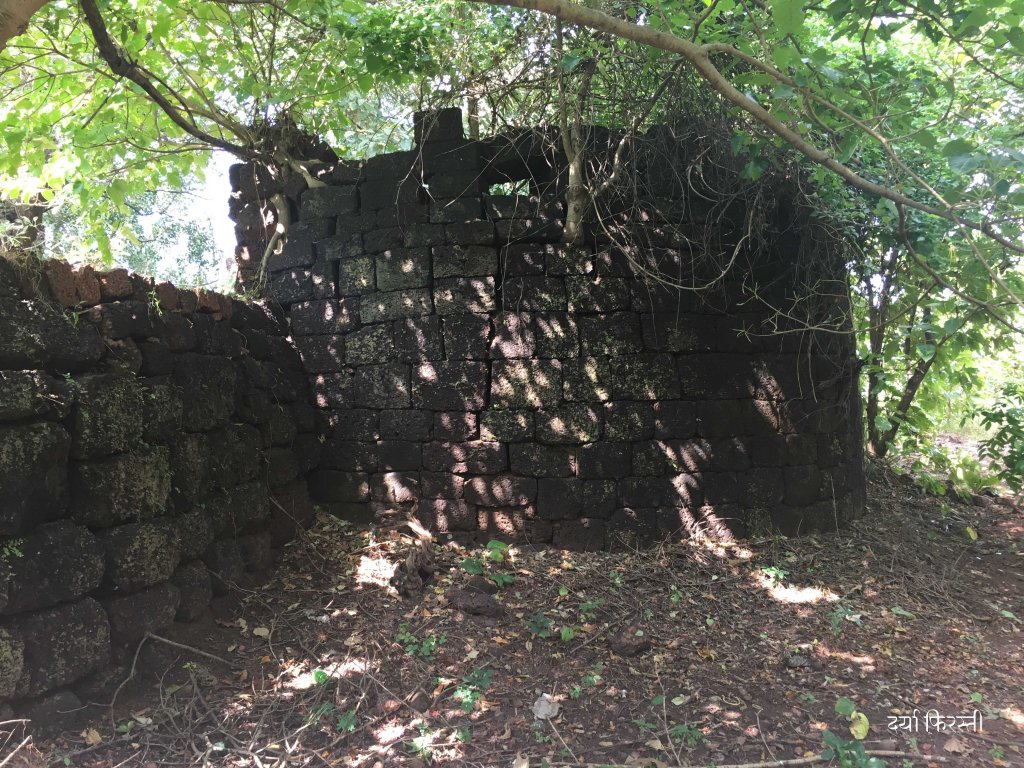 दरवाजाला लागून असलेली तटबंदी जांभा दगडाचे प्रचंड चिरे एकमेकांवर रचून बांधलेली दिसते. इथेही मध्ये काही जोडणी करणारे सिमेंटिंग मटेरियल चुना/ शिसे वगैरे वापरलेले दिसले नाही.