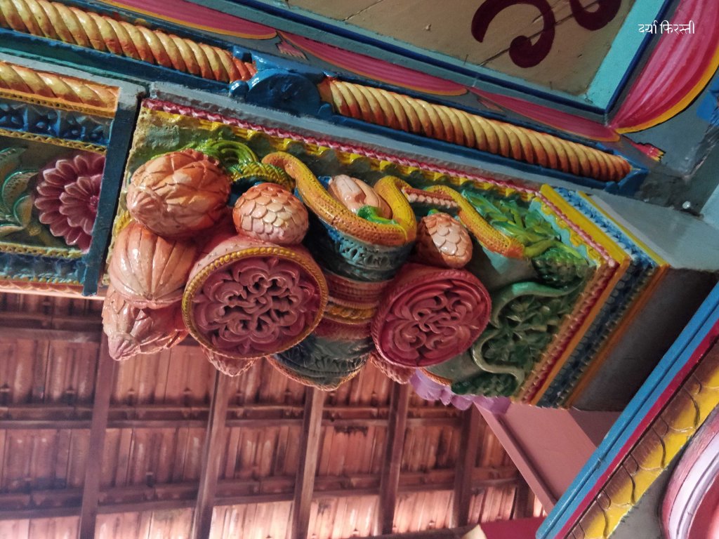 या मंदिरात असलेलं लाकडी कोरीवकाम फारच देखणं आहे. फुलांच्या वेलबुट्ट्या आणि नाग प्रतिमा अशी विविध शिल्पे इथं कोरलेली दिसतात.