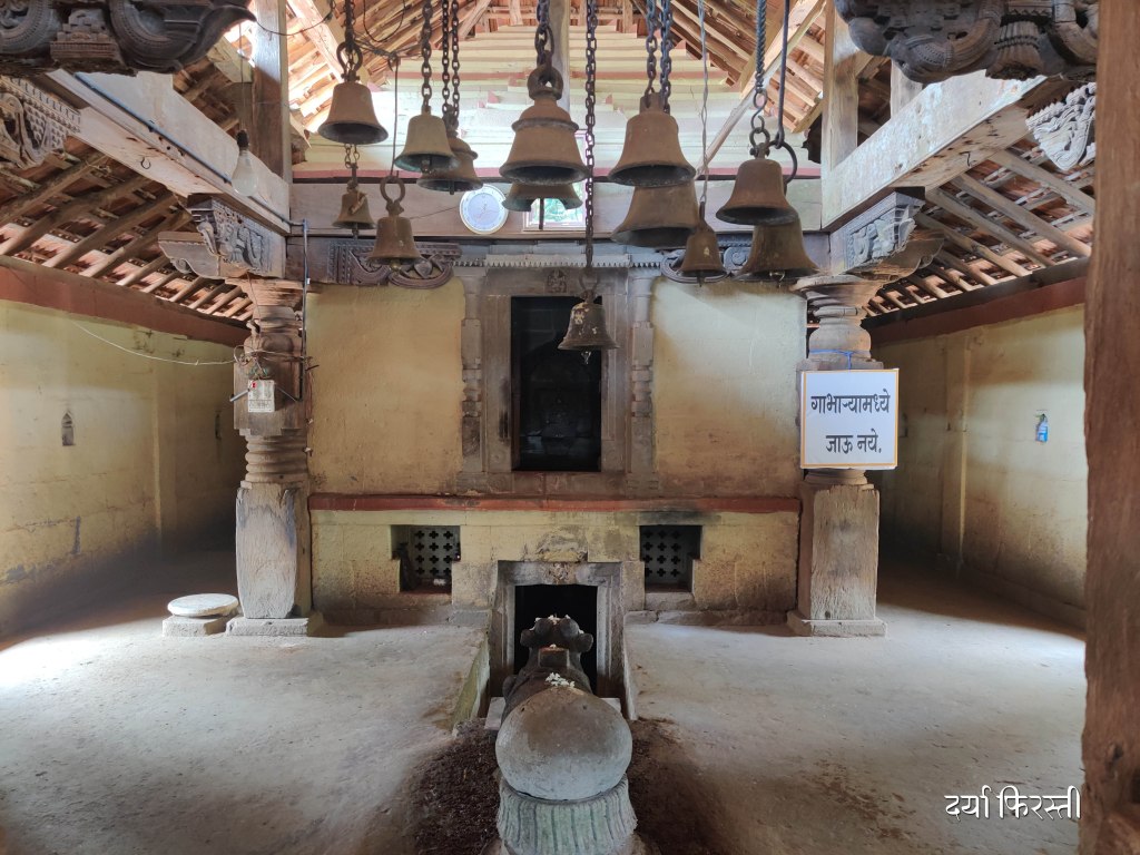 या मंदिराचे गर्भगृह म्हणजेच गाभारा दुमजली आहे. वरच्या बाजूला श्रीगणेशाची मूर्ती आहे तर खालच्या मजल्यावर श्री शिवशंकराची पिंडी. अशी रचना मी अजून कोणत्याही मंदिरात आजपर्यंत पाहिलेली नाही. या मंदिराची बांधणी पेशवेकालीन असावी असे वाटते. जरी गर्भगृह दगडी खांबांवर बांधलेले असले तरीही इतर ठिकाणी लाकडाचे खांब अतिशय सुंदर लाकडी कोरीव काम या मंदिराची अजून एक खासियत आहे असे म्हणता येईल.
