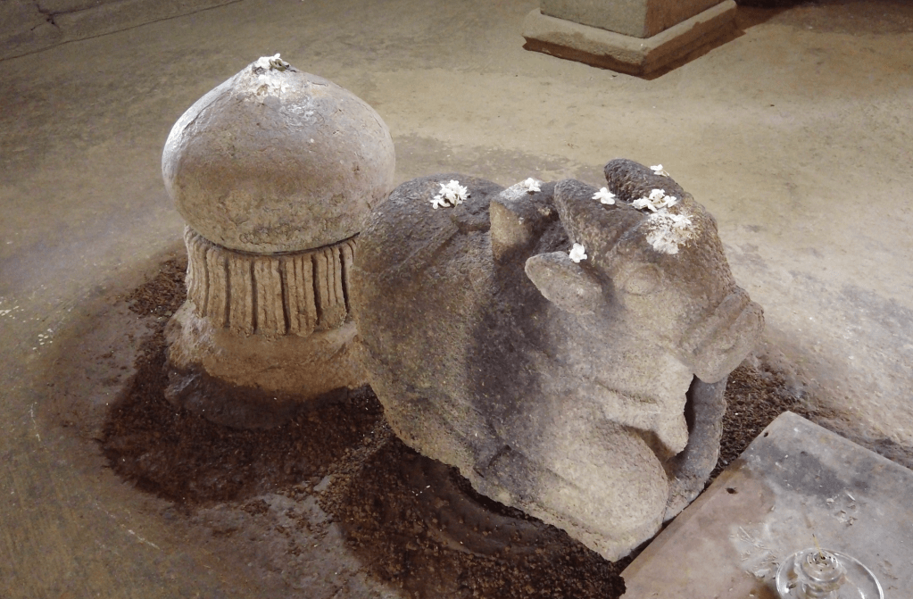 इथं नंदीच्या मागे ही वैशिष्ट्यपूर्ण गोष्ट दिसली. त्यावर गंध फुले कुंकू वाहून पूजनही झालेलं दिसलं. दगडी बांधकामाच्या अवशेषातील हा भाग इथं पूर्वीपासून ठेवलेला आहे. त्याला काही विशिष्ट अर्थ असल्याचे स्थानिकांना व पुरोहितांनाही सांगता आले नाही.