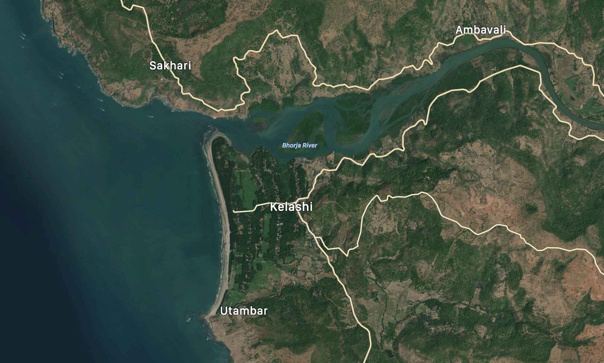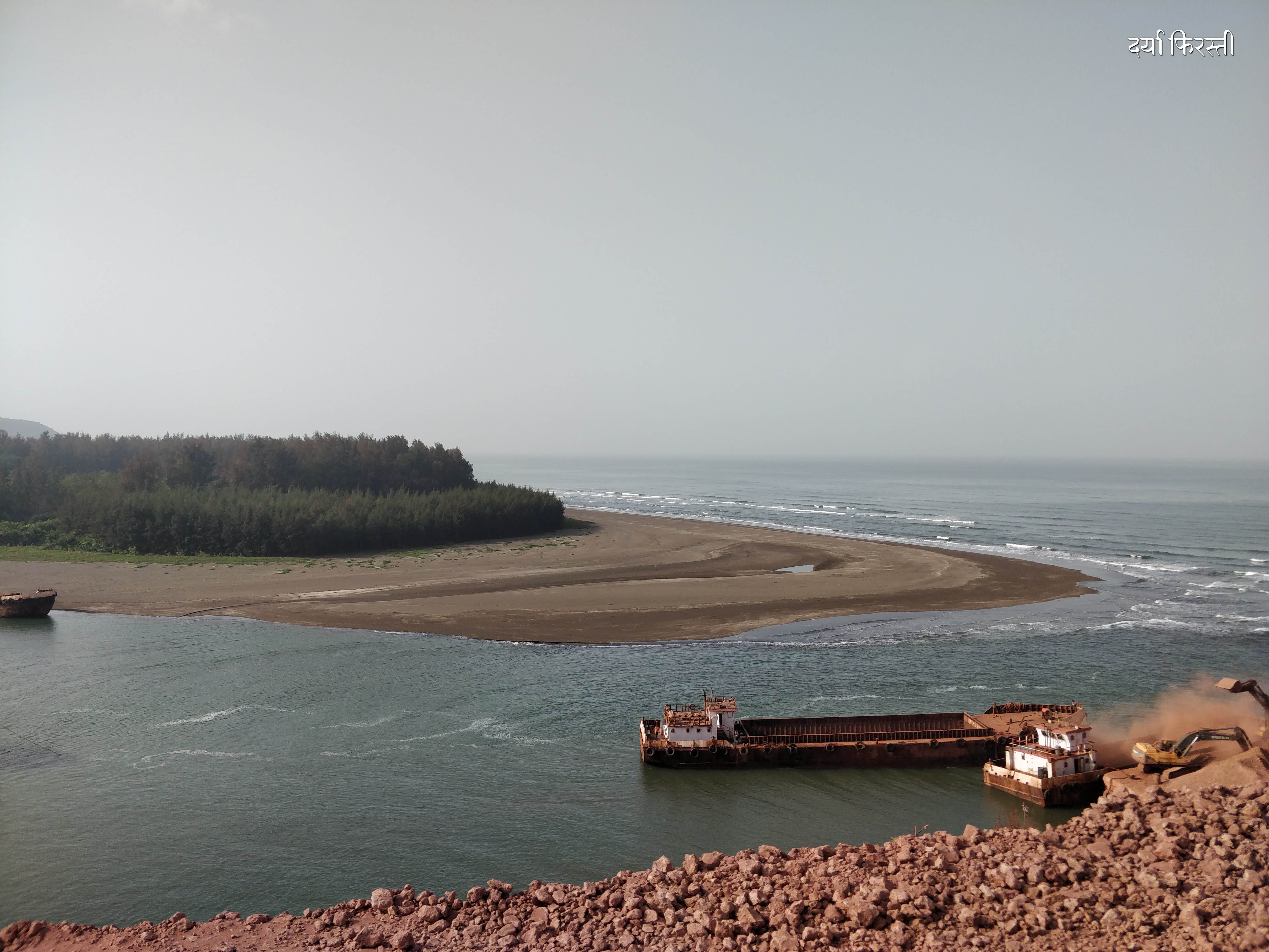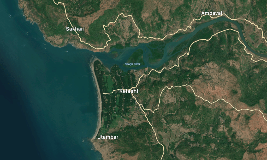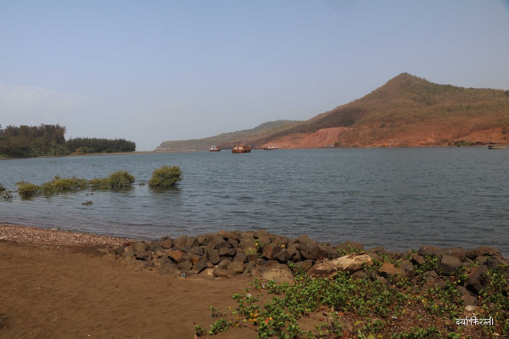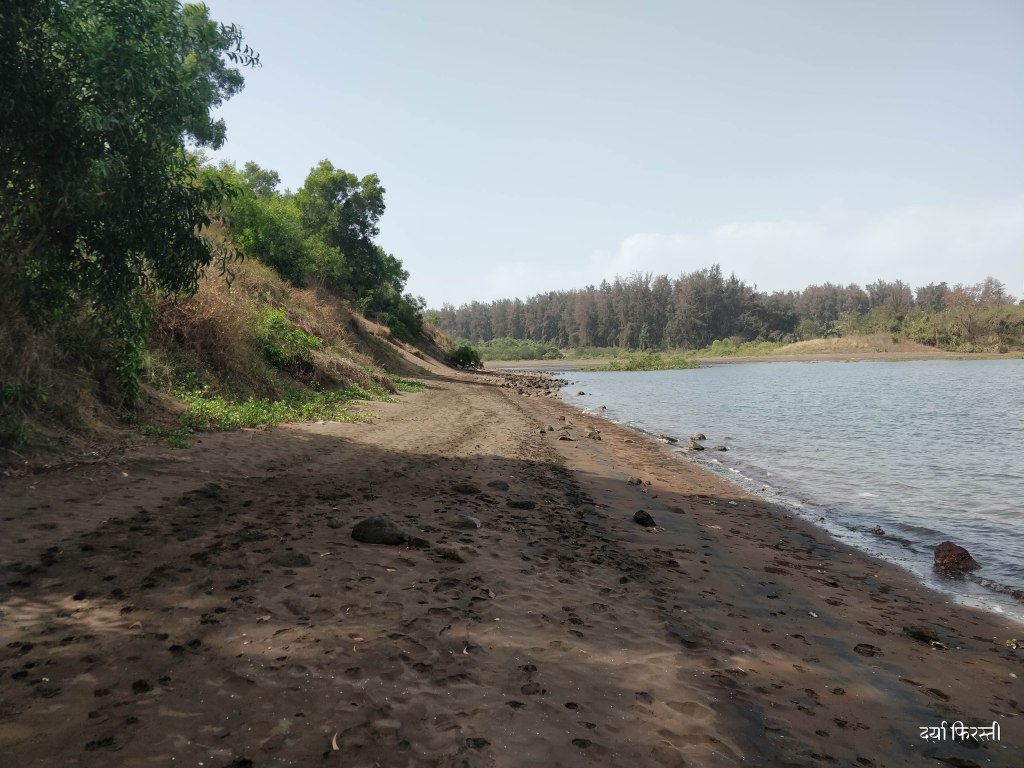 भारजा नदीच्या मुखाशी आलं की मग समुद्रकिनाऱ्याच्या खाऱ्या आसमंताची चाहूल लागते. काळसर चिखल असलेली वाळू, स्वच्छ पण उथळ प्रवाह, नदीचं खाडीत मिसळून जाणं, कांदळवनाची हिरवळ असा देखावा आपलं लक्ष वेधून घेतो. क्षितिजरेषेपाशी समुद्र दिसायला लागलेला असतो.