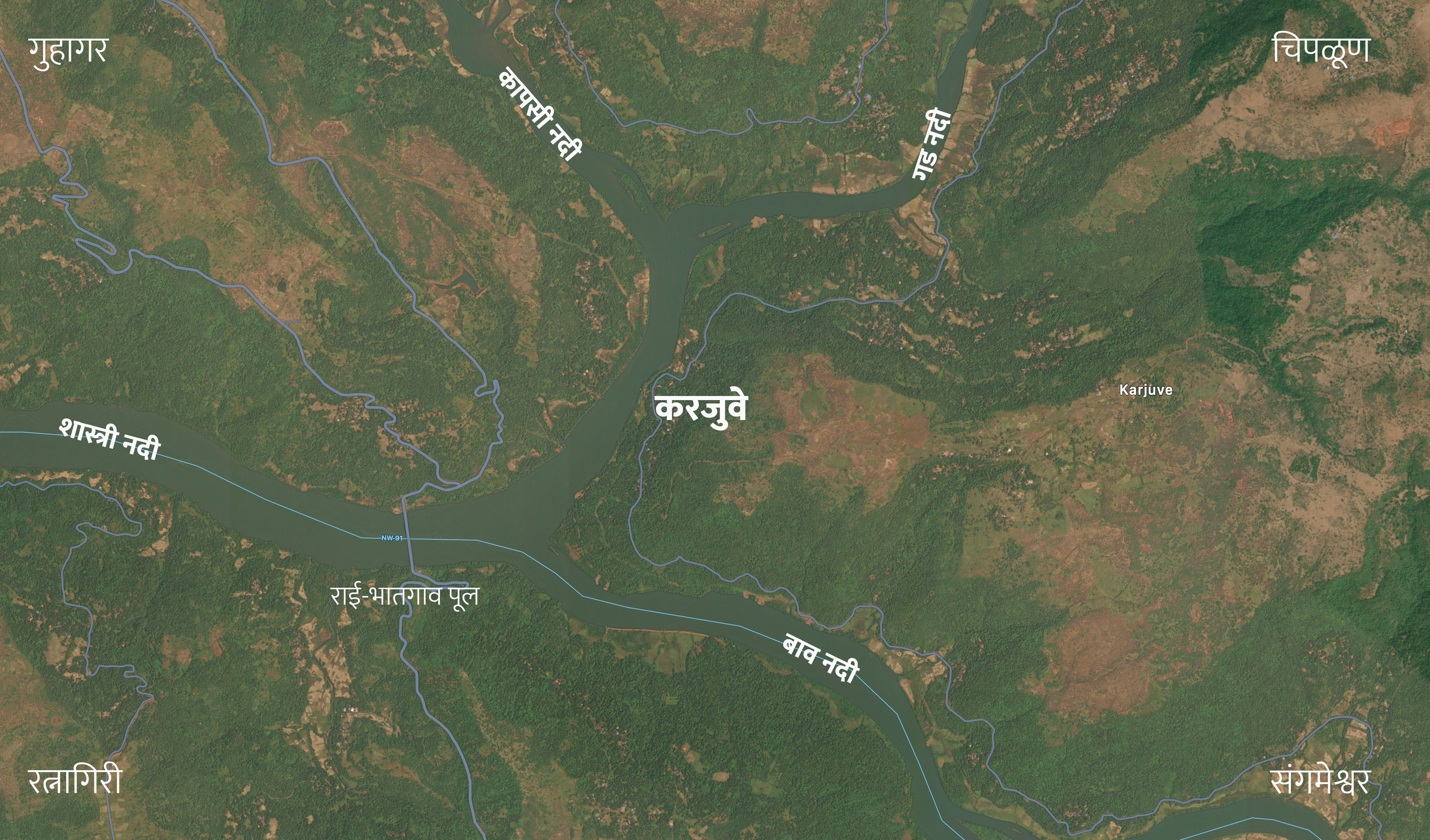 करजुवे गाव तसे कोणत्याही हमरस्त्यावर नाही.. पण मुद्दाम जाऊन पाहायला हवे असे हे ठिकाण.. इथं काही विशेष वेगळे पर्यटन स्थळ आहे का? तर नाही.. पण भौगोलिकदृष्ट्या विलक्षण ठिकाणी वसलेले हे गाव अनुभवणे म्हणजे निसर्गसंपदेने नटलेल्या नीरव शांततेत स्वतःचे अस्तित्व हरवून बसणे. आशुतोष बापटांच्या संगमेश्वर वरील पुस्तकात या गावचे सुंदर वर्णन वाचले होते. कधीतरी तिथं जायचं हे नक्की केलं होतं. कापसी नदी, गड नदी (सिंधुदुर्ग जिल्ह्यातील गड नदी वेगळी) आणि बाव नदीच्या संगमावर वसलेलं हे ठिकाण.. इथं तिसंगवाडीला हे तीन प्रवाह एकत्र येऊन जयगड किंवा शास्त्री नदी बनते