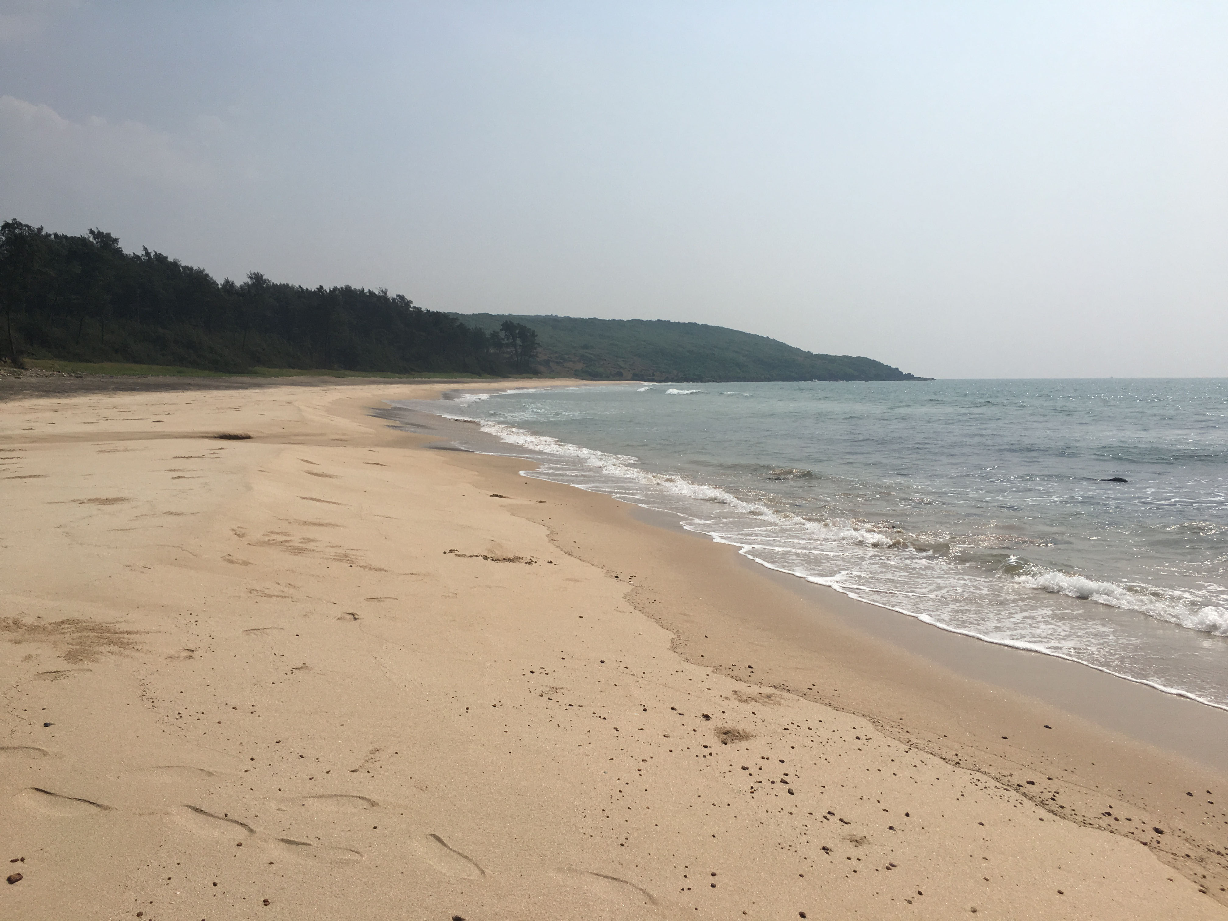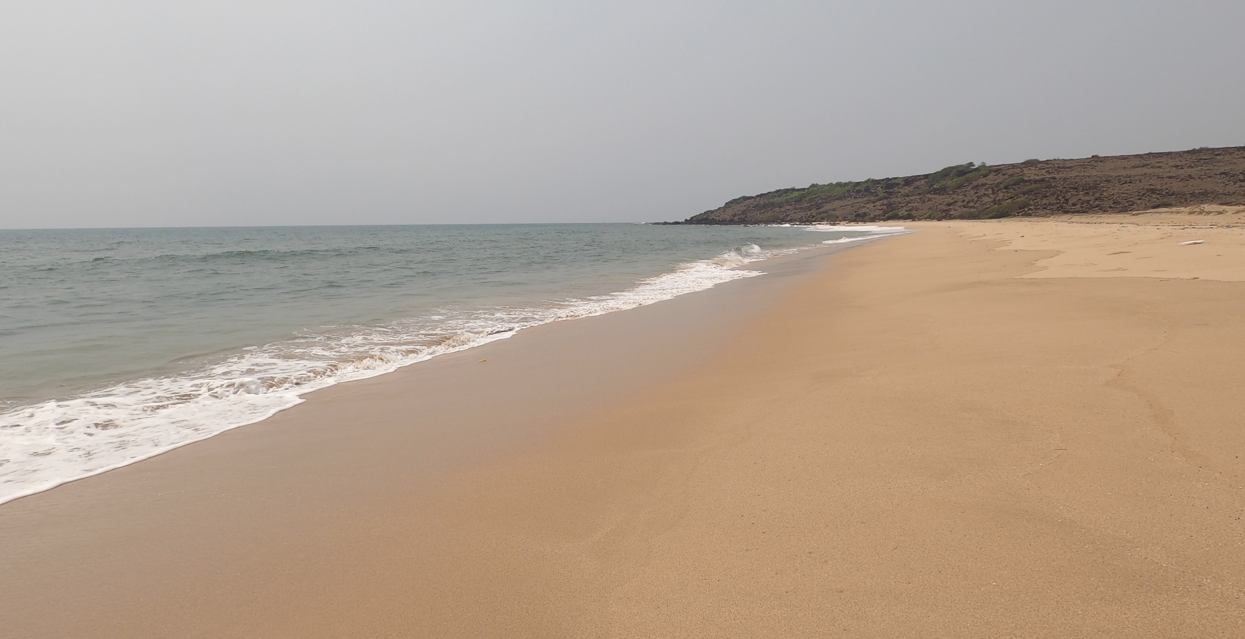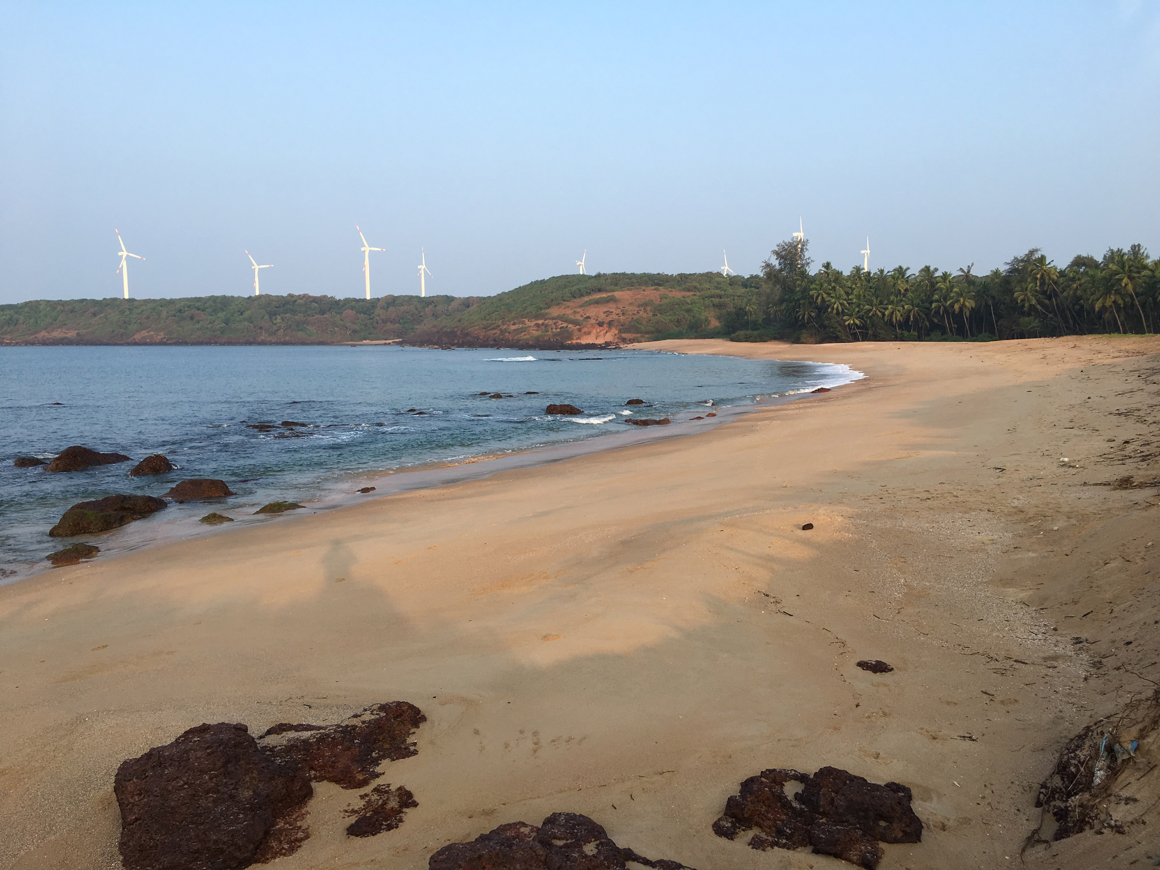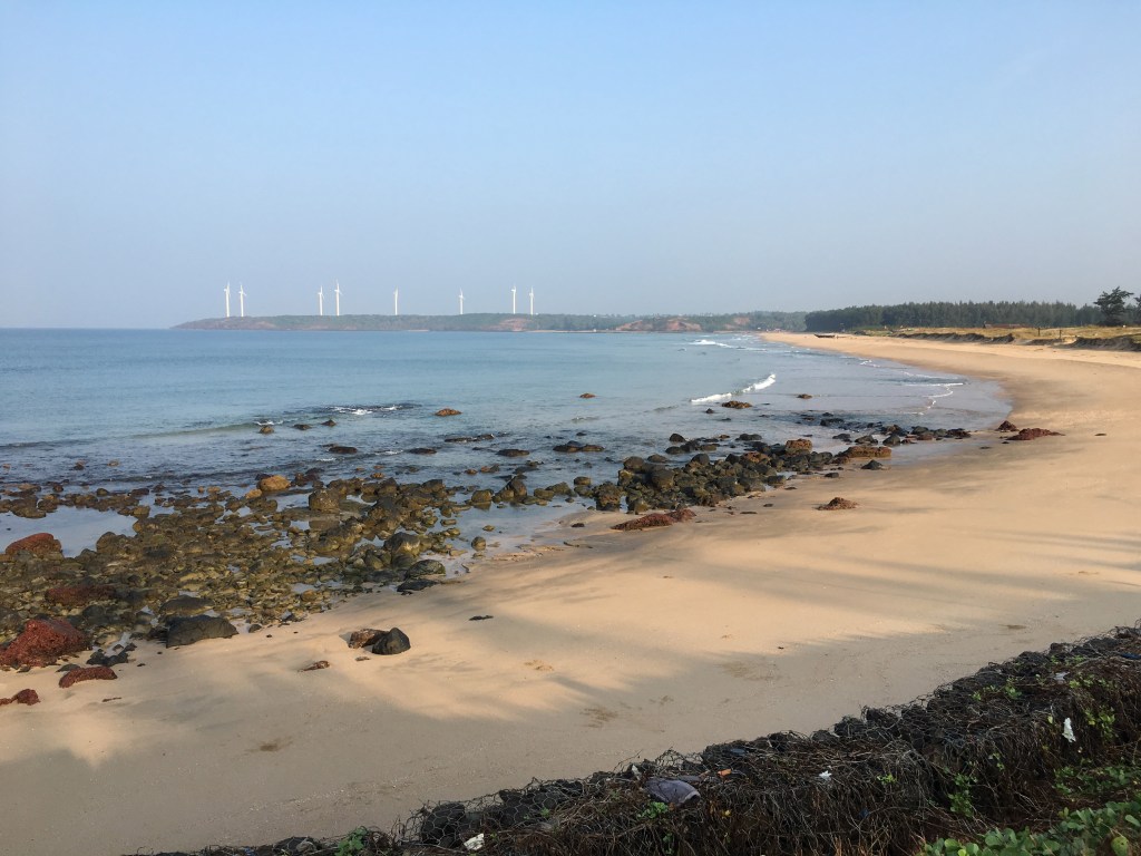 आसमंत जर धुक्याने भरलेले नसेल तर विविध रंगांची उधळण इथं आपण पाहू शकतो.. वाळू अगदी पांढरी शुभ्र नसून थोडीशी कॅरॅमल रंगाची आठवण करून देणाऱ्या छटेने नटलेली आहे.. समुद्राच्या पाण्याचा रंग कसा वर्णावा? निळ्या हिरव्या रंगाच्या हजारो गडद फिकट छटा आणि फेसाळलेल्या लाटांच्या सफेदीची किनार.. आणि त्या रंगांना बदलत जाणारी लाटांची आवर्तने.. अशा ठिकाणी अनवाणी चालता चालता मखमली वाळूची ऊब आणि थंडगार पाण्याचा निववणारा स्पर्श अनुभवत तासभर कसा जातो कळतही नाही.. किनाऱ्याच्या उत्तर टोकाला देवगडचा डोंगर आणि त्यावर बांधलेल्या पवनचक्क्या आपल्याला खुणावत असतात.