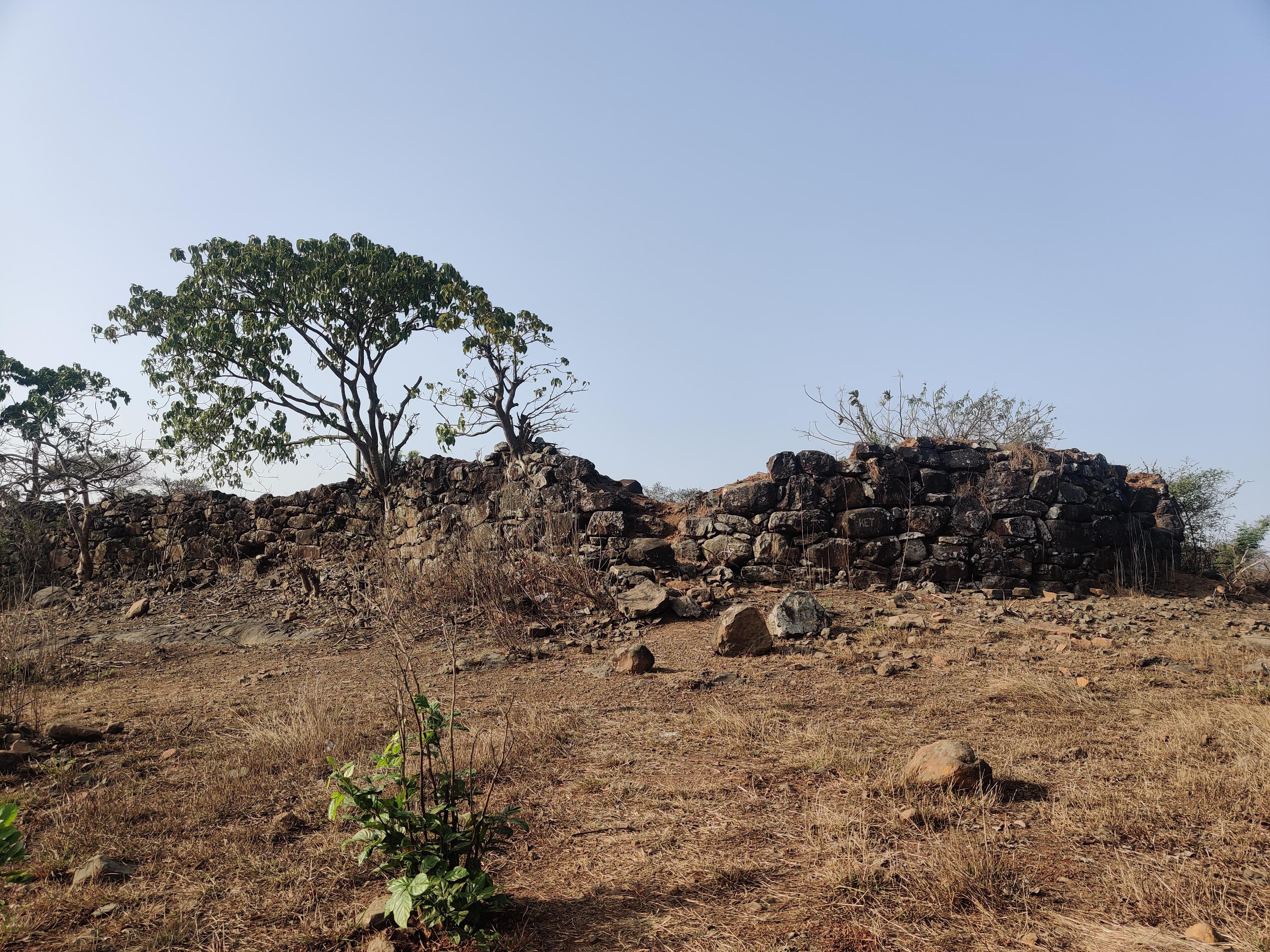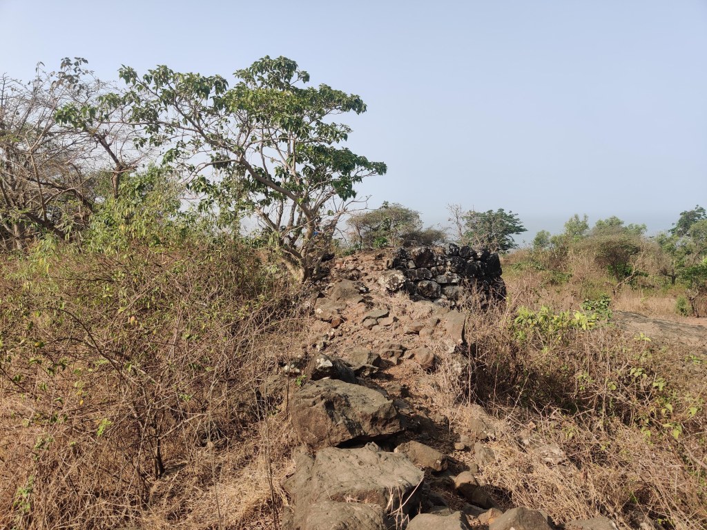 एकदरा गाव हे कोळ्यांचे गाव.. तिथं चौकशी केली तर सुरुवातीला कोणी इथं किल्ला आहे हे सांगेचना.. मग विडी ओढत बसलेले एक आजोबा दिसले.. त्यांना विचारलं की सामराजगड आहे कुठं.. तरी कळेना.. मग म्हंटलं इथं डोंगरावर काय आहे.. किल्ला आहे का.. तेव्हा आजोबा म्हणाले की शिवमंदिराच्या मागे पायवाट आहे ती सरळ वर घेऊन जाईल तिथं काही जुने बांधकाम सापडेल… गुगल मॅपवर मला तेच ठिकाण दिसले होते त्यामुळे आजोबांनी सांगितलेल्या वाटेने वर चढत निघालो. सुमारे मीटर किंवा फूट उंच ही चढण चढायला १५ मिनिटे लागली असावीत.