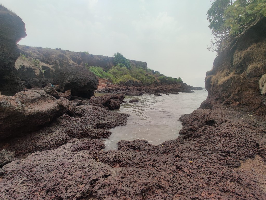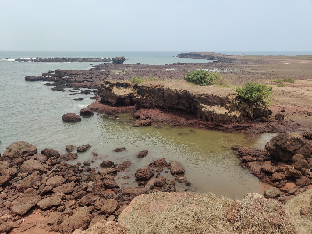 अतिशय रुक्ष राकट असं हे ठिकाण. किनारा म्हणावा तर वाळूची पुळण नाही.. समुद्रापर्यंत असलेली लाल माती आणि जांभा खडकाचे चित्रविचित्र आकार. महाराष्ट्राच्या किनारपट्टीचे भौगोलिक सर्वेक्षण करून पुण्याचे प्राध्यापक श्रीकांत कार्लेकर यांनी फार माहितीपूर्ण पुस्तके लिहीली आहेत. हल्ली या विषयावरील महाराष्ट्राची सागर संपदा असे नवीन आणि फोटो युक्त पुस्तक मला माझी मैत्रीण मानसी सोमण मराठेंच्या संग्रहात वाचायला मिळाले. विशाल भावे अतुल साठे आणि दीपक आपटे या पुस्तकाचे लेखक. त्यांच्या मते असे खडकाळ किनारे आणि तिथली डबकी हे जैव वैविध्याचा अभ्यास करण्यासाठी उपयुक्त ठिकाण असते. इथं प्रवाळ, शैवाल, कालवे, विविध प्रकारचे खेकडे, समुद्री गोगलगायी वगैरे साठी उत्तम अधिवास असतो.