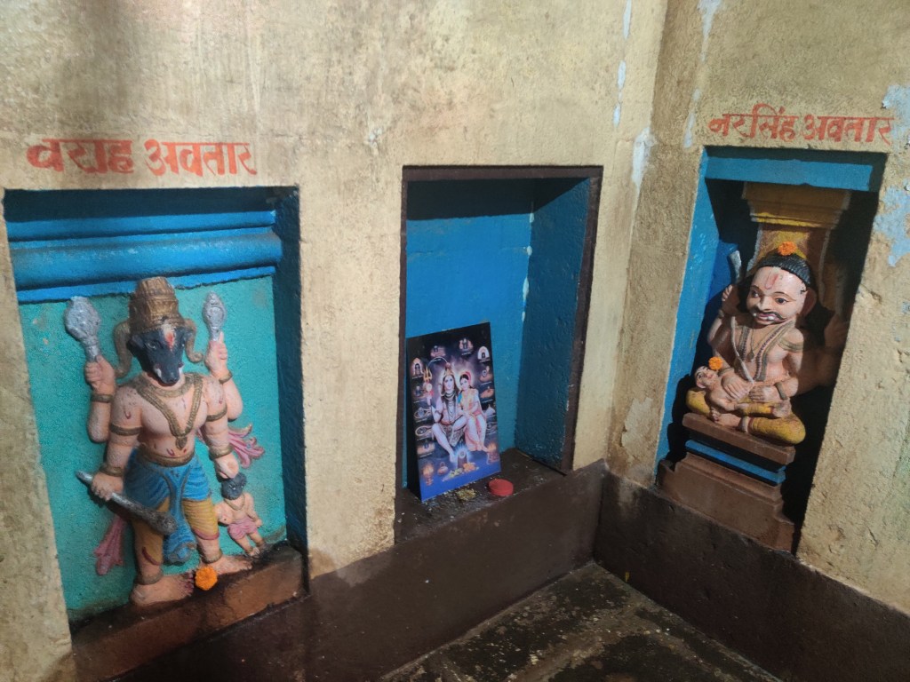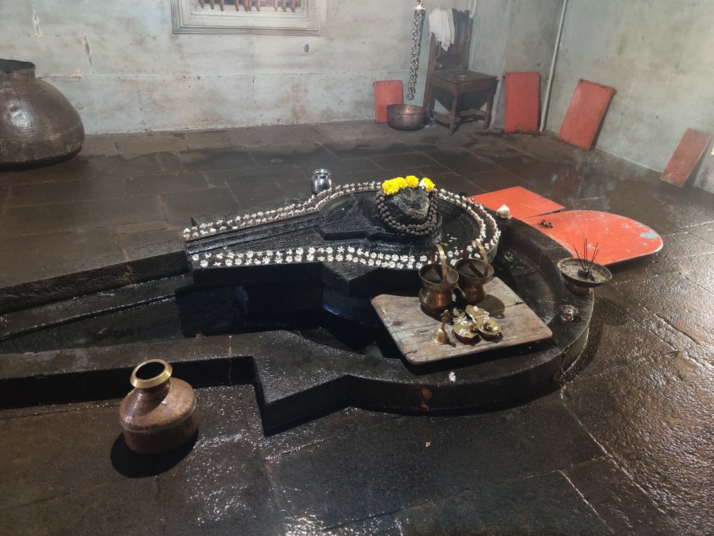 इथल्या गाभाऱ्याला पायरी नाही हे एक खास वैशिष्ट्य म्हणता येईल. मंदिर शंकराचं असलं तरी संभामंडपाच्या कोनाड्यात दशावतार मूर्ती दिसल्या.. पिंडीवर अतिशय सुबक अशी फुलांची सजावट होती.. पाच शिखरांचे हे मंदिर सरदार गोविंदपंत बुंदेलेंच्या कडून बांधले गेले असं अभ्यासक श्री आशुतोष बापट नमूद करतात. त्यांचे संगमेश्वर तालुक्यावरील पुस्तक अतिशय वाचनीय आणि संग्रह करण्याजोगे आहे.
