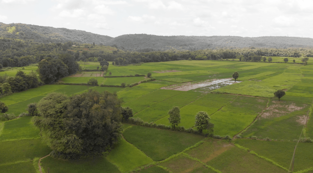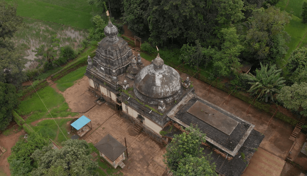 शास्त्री नदीच्या अगदी जवळ असलेला हा परिसर हिरव्याकंच शेतांनी बहरलेला दिसत होता.. जिथवर नजर जाईल तिथवर हिरवळीचा गालिचा अंथरला आहे असं वाटत होतं.. हिरव्या रंगाच्या असंख्य छटा.. शेतांमध्ये राखण करत उभे असलेले वृक्ष अन नदीच्या पल्याड पार बुरंबाड-माखजन च्या डोंगरापर्यंत पसरलेला निसर्गाचा खजिना असं ते दृश्य मी ड्रोनने टिपलं आणि मग शिवदर्शनासाठी आणि ते सुंदर मंदिर पाहण्यासाठी आत गेलो.