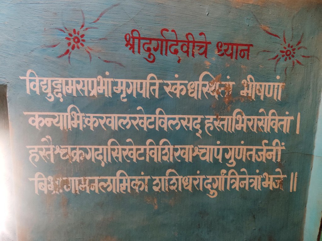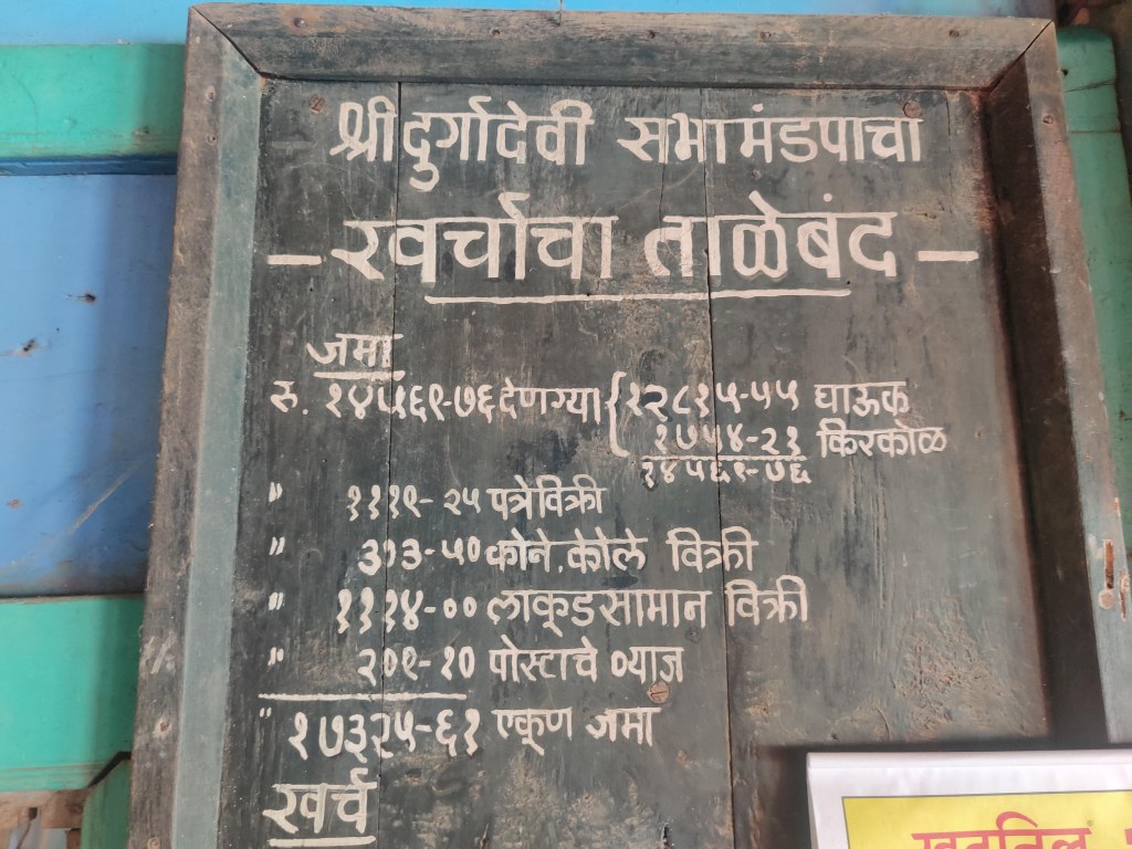 चित्पावनांची कुलदेवता अंबेजोगाईची योगेश्वरी. पण कोकणातील दुर्गा हे तिचेच रूप असेही मानले जाते.. त्यामुळे दुर्गादेवी हे चित्पावनांसाठी महत्वाचे आराध्य. दुर्गादेवीचे ध्यान करण्यासाठीचा श्लोक आणि सभामंडप बांधला त्या खर्चाचा ताळेबंद या दोन्ही गोष्टींची माहिती इथं रंगवलेल्या तपशीलातून लक्षात येते. साधारणपणे सतरा हजार रुपयांत हे काम झाले असे दिसते आहे.