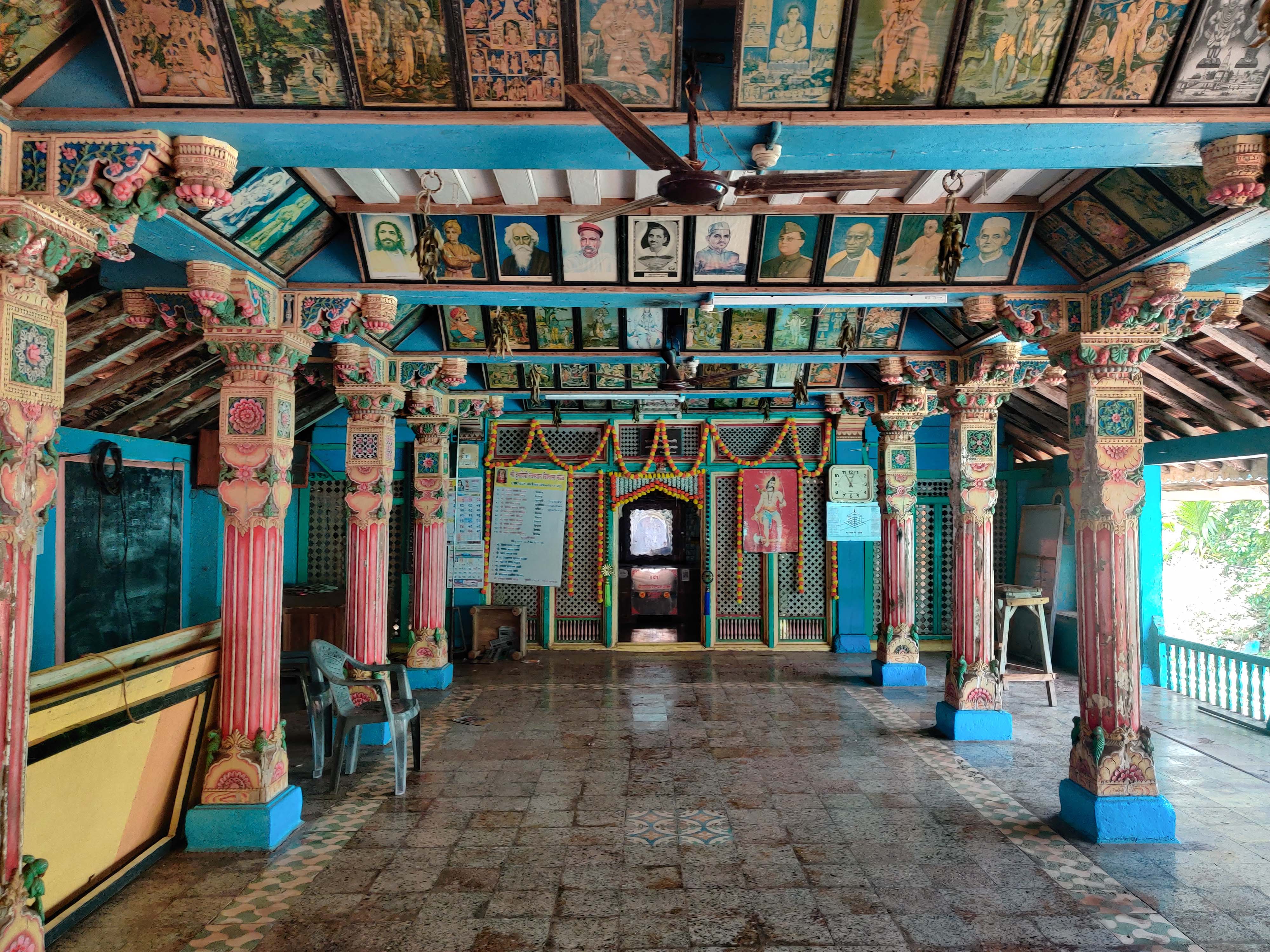 या मंदिराच्या सभामंडपाच्या बाबतीत मला खूपच रंजक वाटलेली गोष्ट म्हणजे इथं असलेले फोटो. अनेक धार्मिक प्रसंग, देवदेवता, आख्यायिका यांचे फोटो तर आहेतच शिवाय विविध राजकीय विचारसरणीच्या मंडळींनीही इथं जागा पटकावली आहे. अगदी डावे किंवा कट्टर कम्युनिस्ट सोडले तर साधारणपणे ही निवड सर्वसमावेशक म्हणायला हरकत नाही. मध्यभागी दीनदयाळ उपाध्याय.. एका बाजूला गोळवलकर, विवेकानंद, महाकवी रवींद्रनाथ ठाकूर असा संमिश्र राजकीय अध्यात्मिक मामला .. मग टिळकांसारखे व्यक्तिमत्व आणि उजवीकडे नेताजी सुभाषचंद्र बोस, लाल बहादूर शास्त्री, वल्लभभाई पटेल, पंडित नेहरू अशी मंडळी.