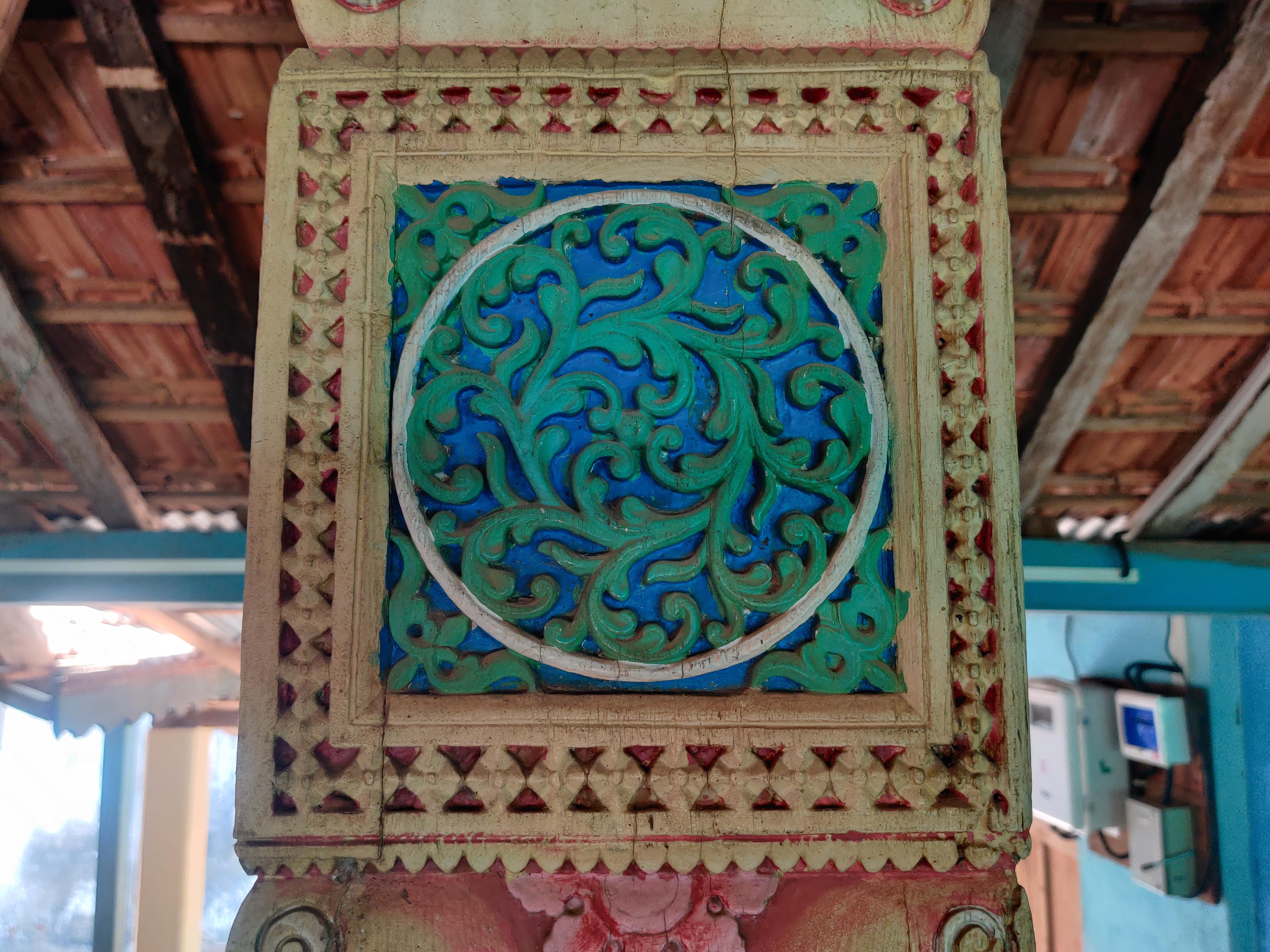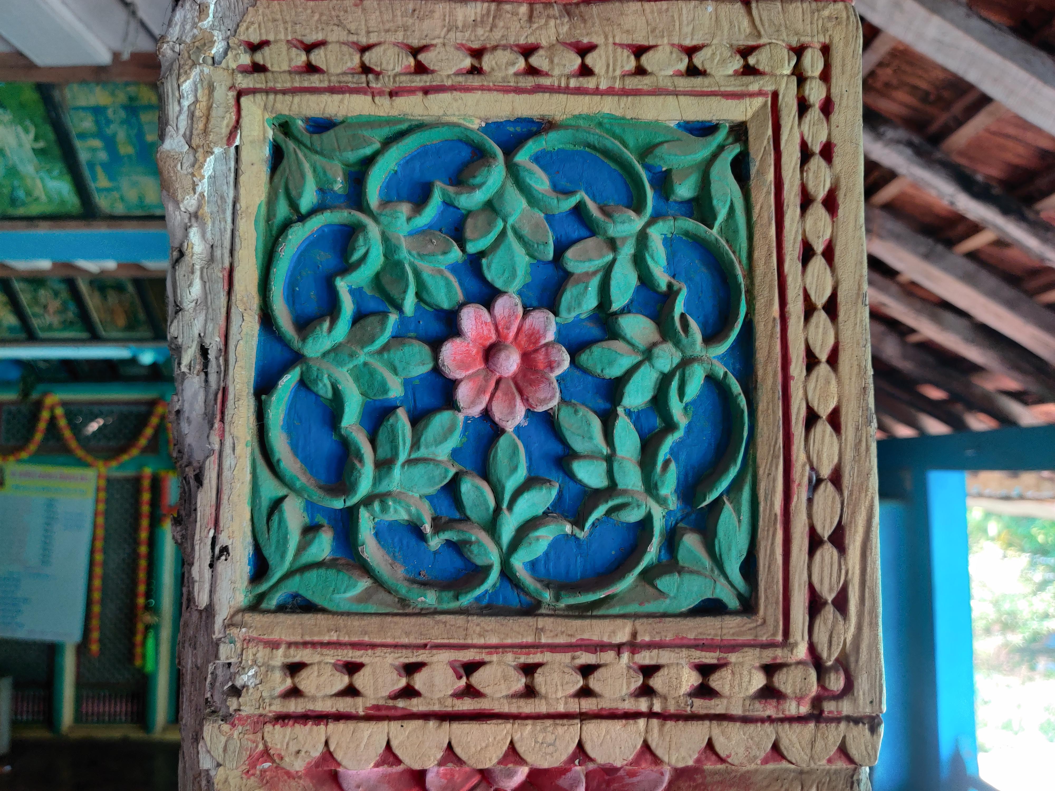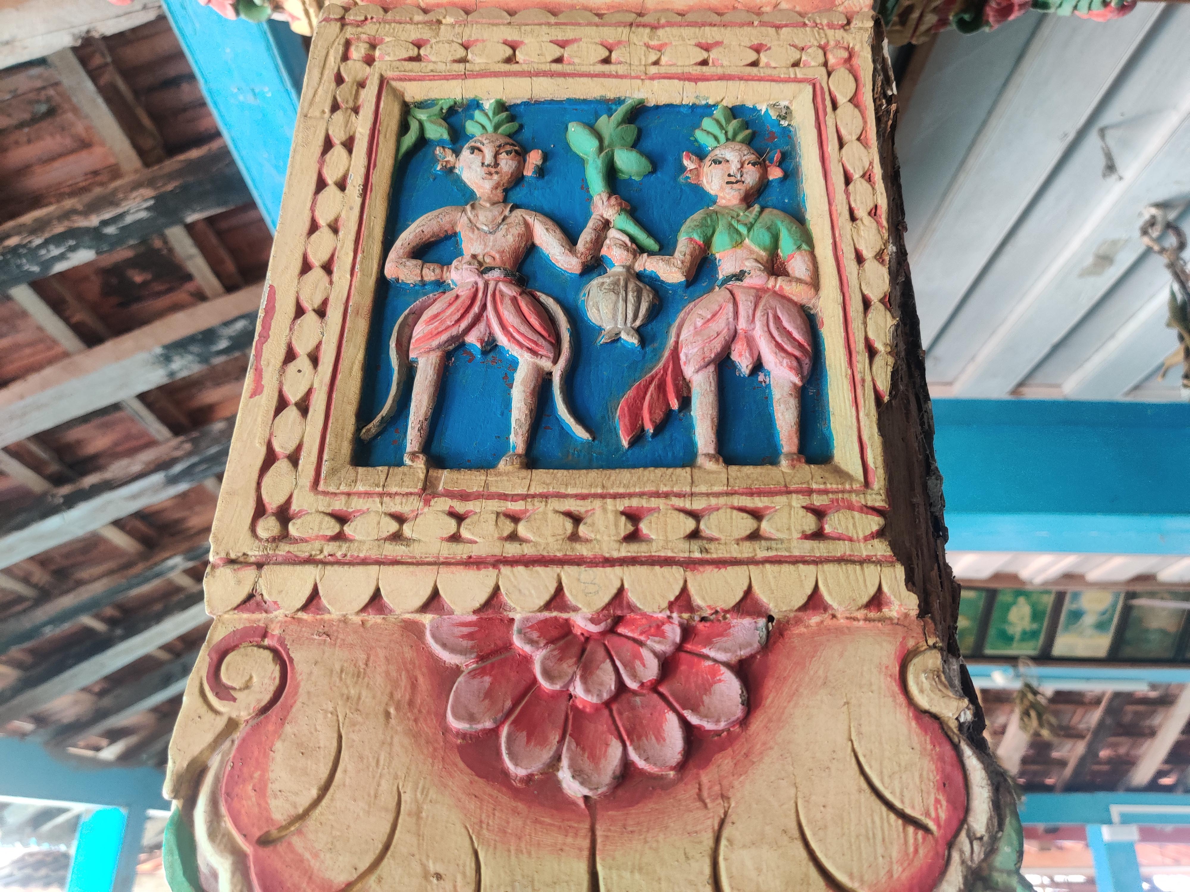 अश्या कोरीवकामासाठी पटाशी सारखी प्राथमिक हत्यारेच वापरली जात. या पटाश्या प्रामुख्याने तीन प्रकारच्या असतात. त्यांची पाती चपटी, अर्धगोलाकार आणि इंग्रजी v च्या आकाराची असतात. कूर्ग आणि केरळ प्रमाणे इथेही फणसाचे लाकूड त्याची उपलब्धता आणि उपयुक्तता लक्षात घेऊन वापरले असावे ही शक्यता डॉ. दीपक कन्नल यांच्यासारखे ज्येष्ठ शिल्पकार आणि शिल्पकला अभ्यासक वर्तवतात. त्यांच्यामते या कोरीवकामात एक fleshy feel आहे. म्हणजेच लाकडाला अगदी बारीक हत्यारे वापरून एक गुळगुळीत, मृदू, मानवी त्वचेसारखे वाटावे असे texture दिले गेलेले दिसते. हे कोरीवकाम करणारे लोक कोण होते, त्यांचे नेतृत्व करणारे अभिकल्पक कोण होते, इथं कोरलेले मोटिफ त्यांना कसे सुचले, त्यांच्यावर कोणत्या शिल्पकला शैलीचा प्रभाव होता असे अनेक प्रश्न अभ्यासनीय आणि आजमितीला तरी अनुत्तरित आहेत. एक जोडपे कलश आणि रोपटे घेऊन उभे आहे असे एका खांबावर कोरलेले दिसते जे मला इतर मंदिरांतील कोरीवकामापेक्षा काहीसे वेगळे वाटले.
