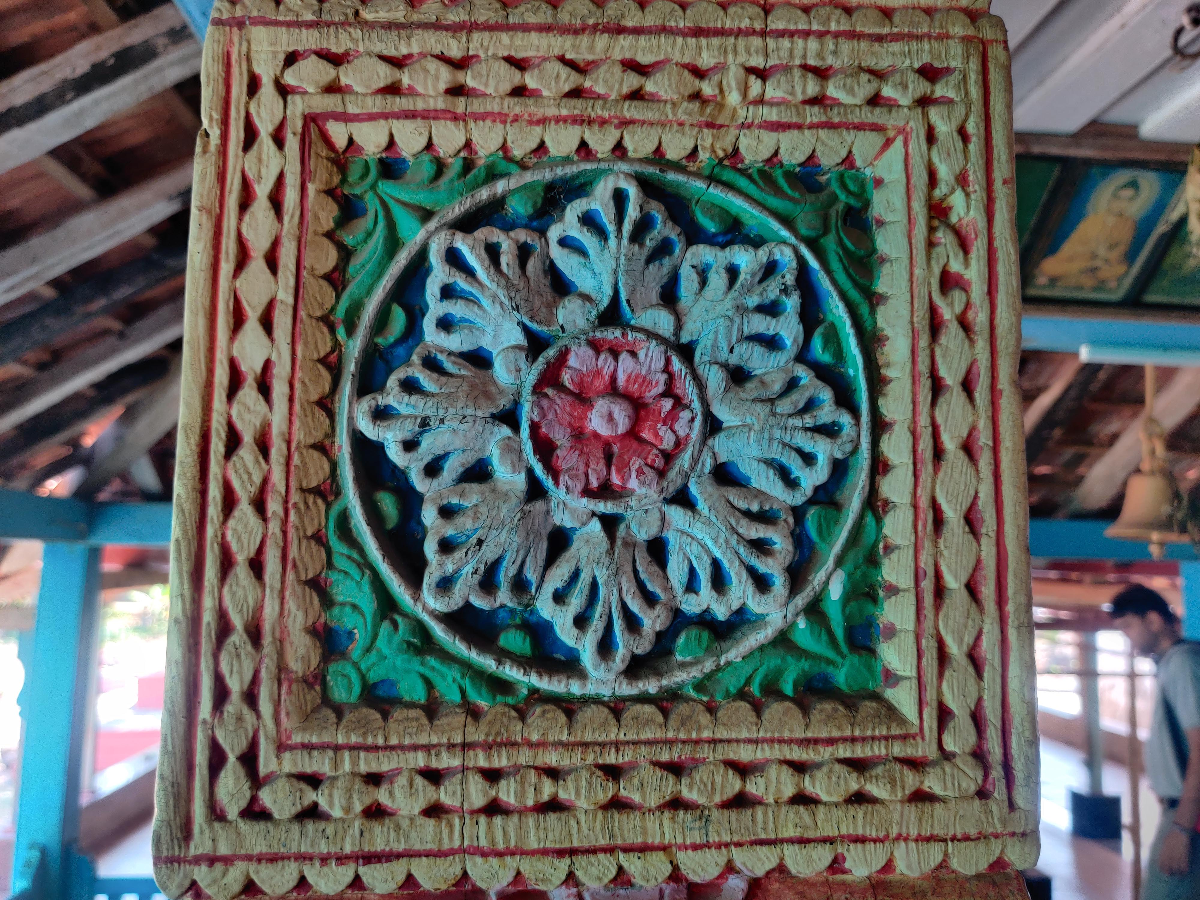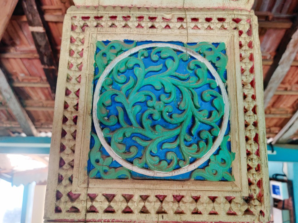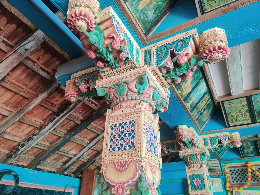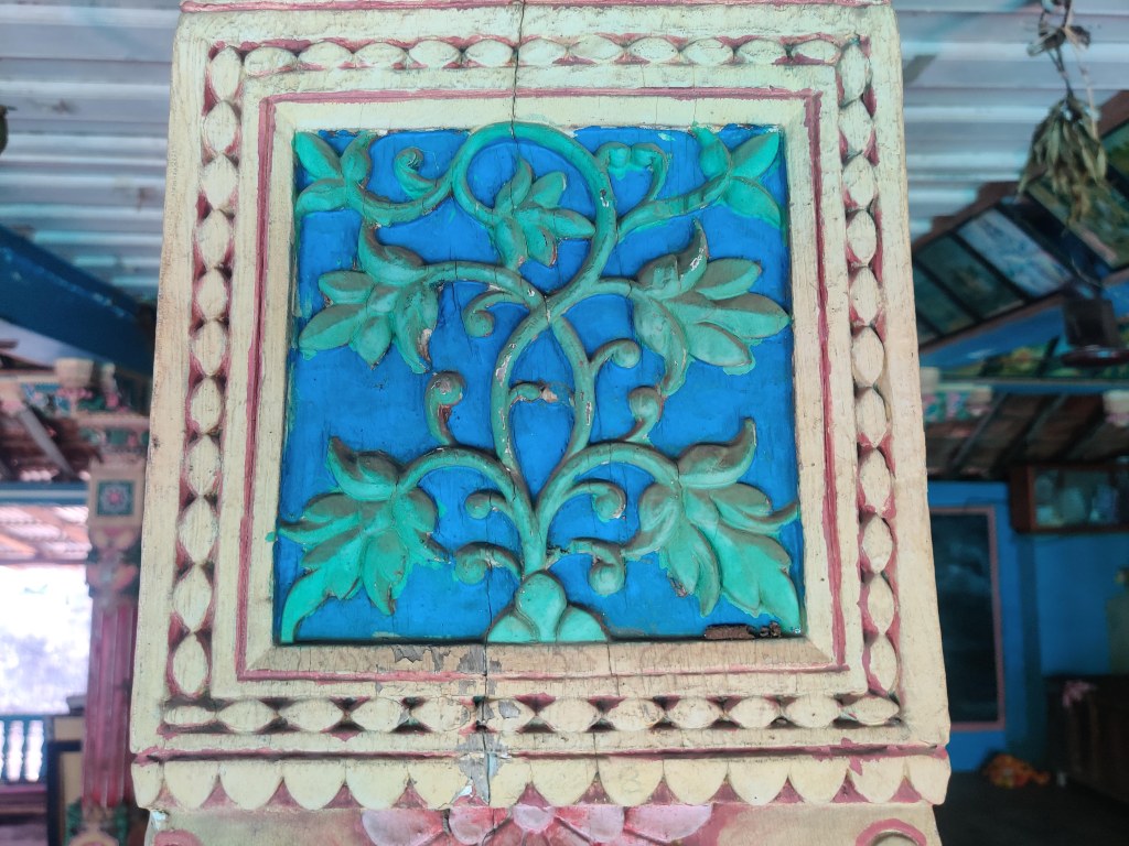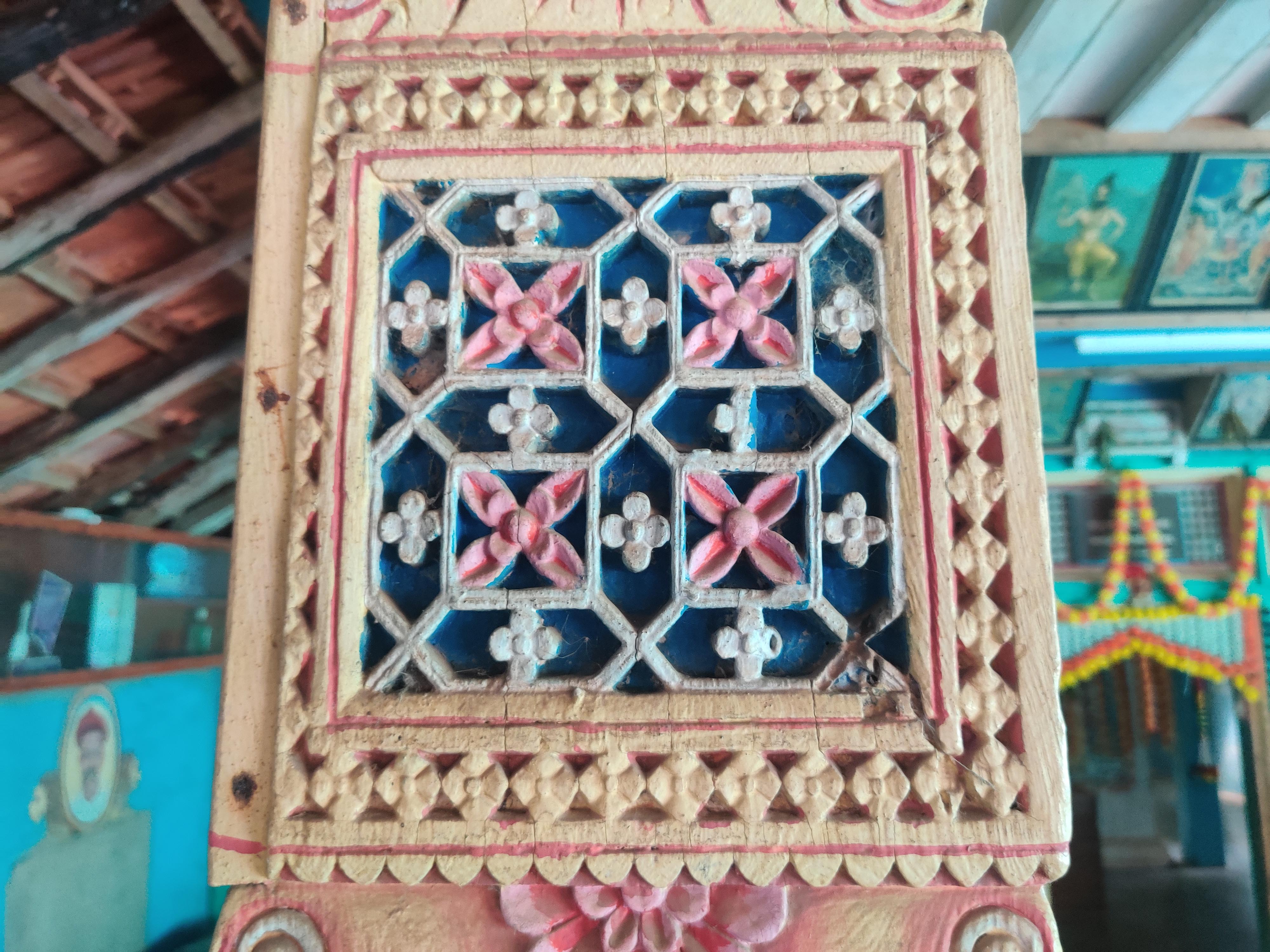 अश्या कोरीवकामासाठी पटाशी सारखी प्राथमिक हत्यारेच वापरली जात. या पटाश्या प्रामुख्याने तीन प्रकारच्या असतात. त्यांची पाती चपटी, अर्धगोलाकार आणि इंग्रजी v च्या आकाराची असतात. कूर्ग आणि केरळ प्रमाणे इथेही फणसाचे लाकूड त्याची उपलब्धता आणि उपयुक्तता लक्षात घेऊन वापरले असावे ही शक्यता डॉ. दीपक कन्नल यांच्यासारखे ज्येष्ठ शिल्पकार आणि शिल्पकला अभ्यासक वर्तवतात. त्यांच्यामते या कोरीवकामात एक fleshy feel आहे. म्हणजेच लाकडाला अगदी बारीक हत्यारे वापरून एक गुळगुळीत, मृदू, मानवी त्वचेसारखे वाटावे असे texture दिले गेलेले दिसते. हे कोरीवकाम करणारे लोक कोण होते, त्यांचे नेतृत्व करणारे अभिकल्पक कोण होते, इथं कोरलेले मोटिफ त्यांना कसे सुचले, त्यांच्यावर कोणत्या शिल्पकला शैलीचा प्रभाव होता असे अनेक प्रश्न अभ्यासनीय आणि आजमितीला तरी अनुत्तरित आहेत. एक जोडपे कलश आणि रोपटे घेऊन उभे आहे असे एका खांबावर कोरलेले दिसते जे मला इतर मंदिरांतील कोरीवकामापेक्षा काहीसे वेगळे वाटले.
