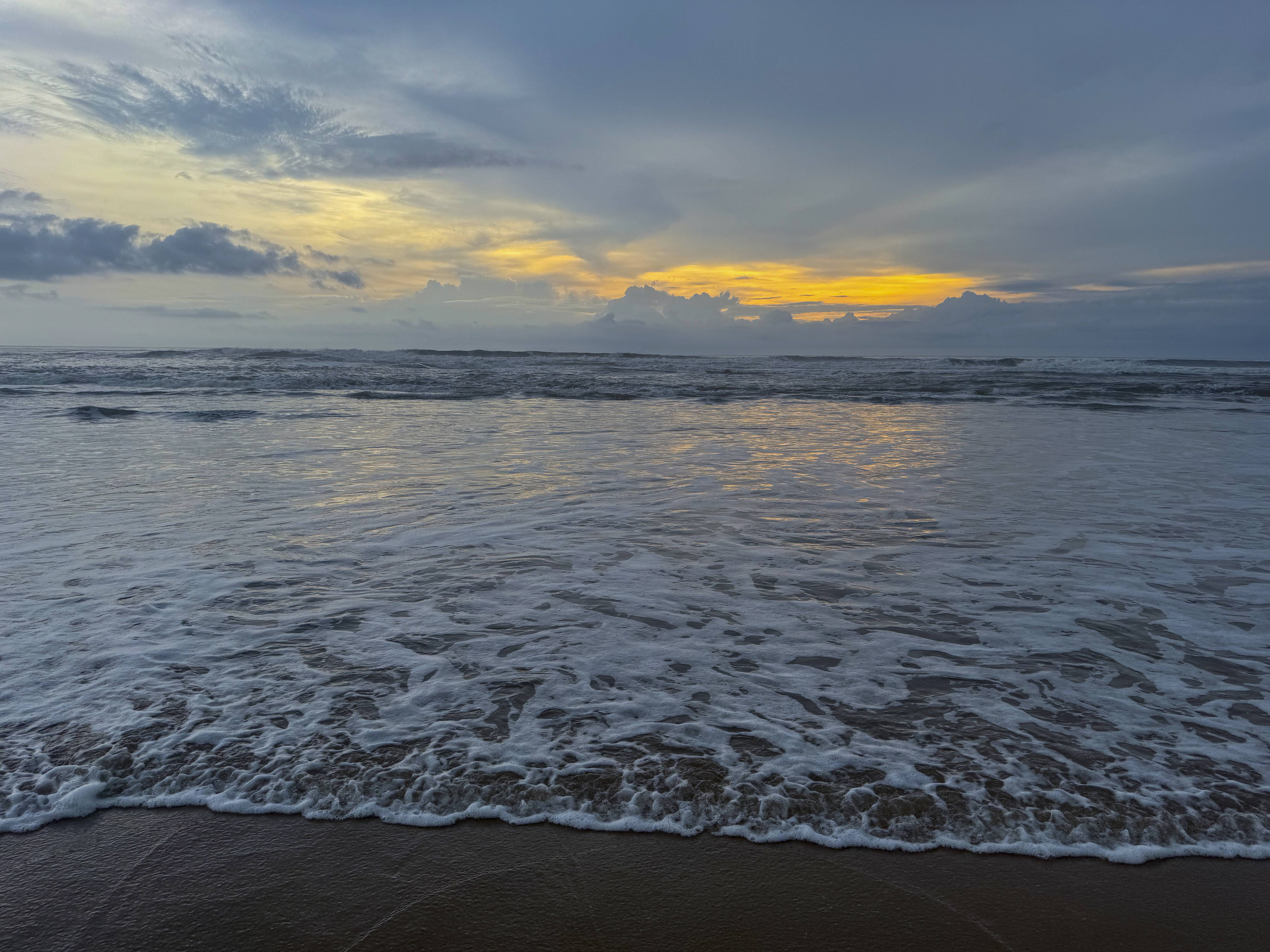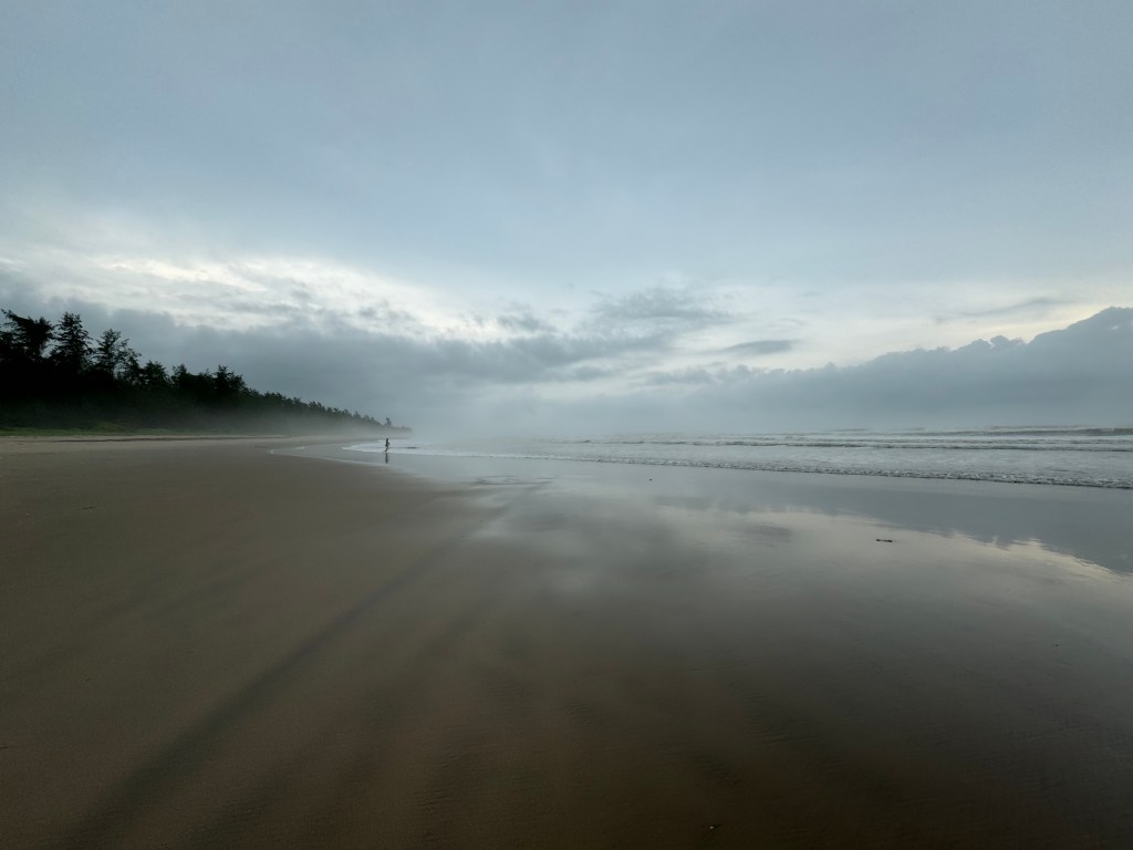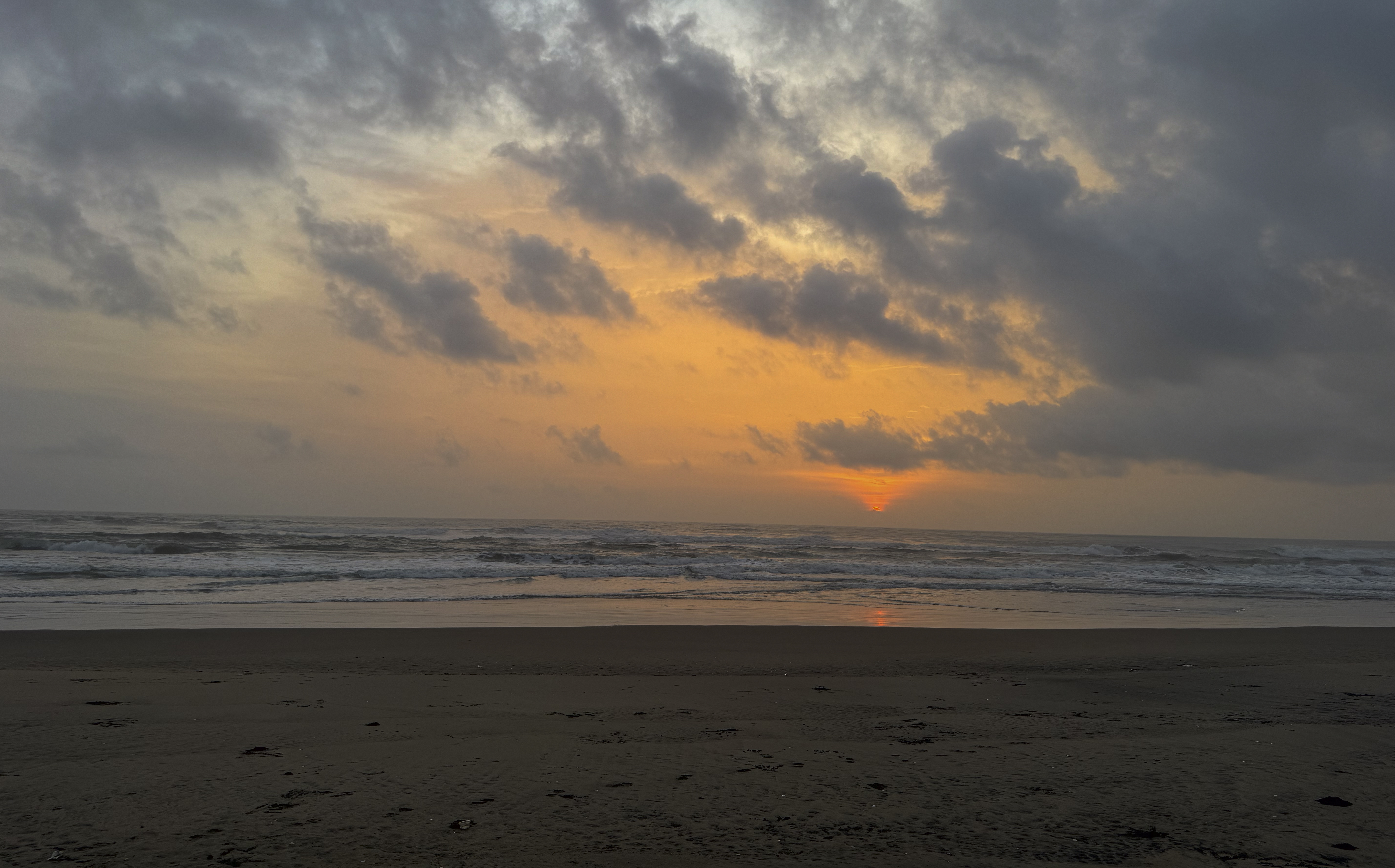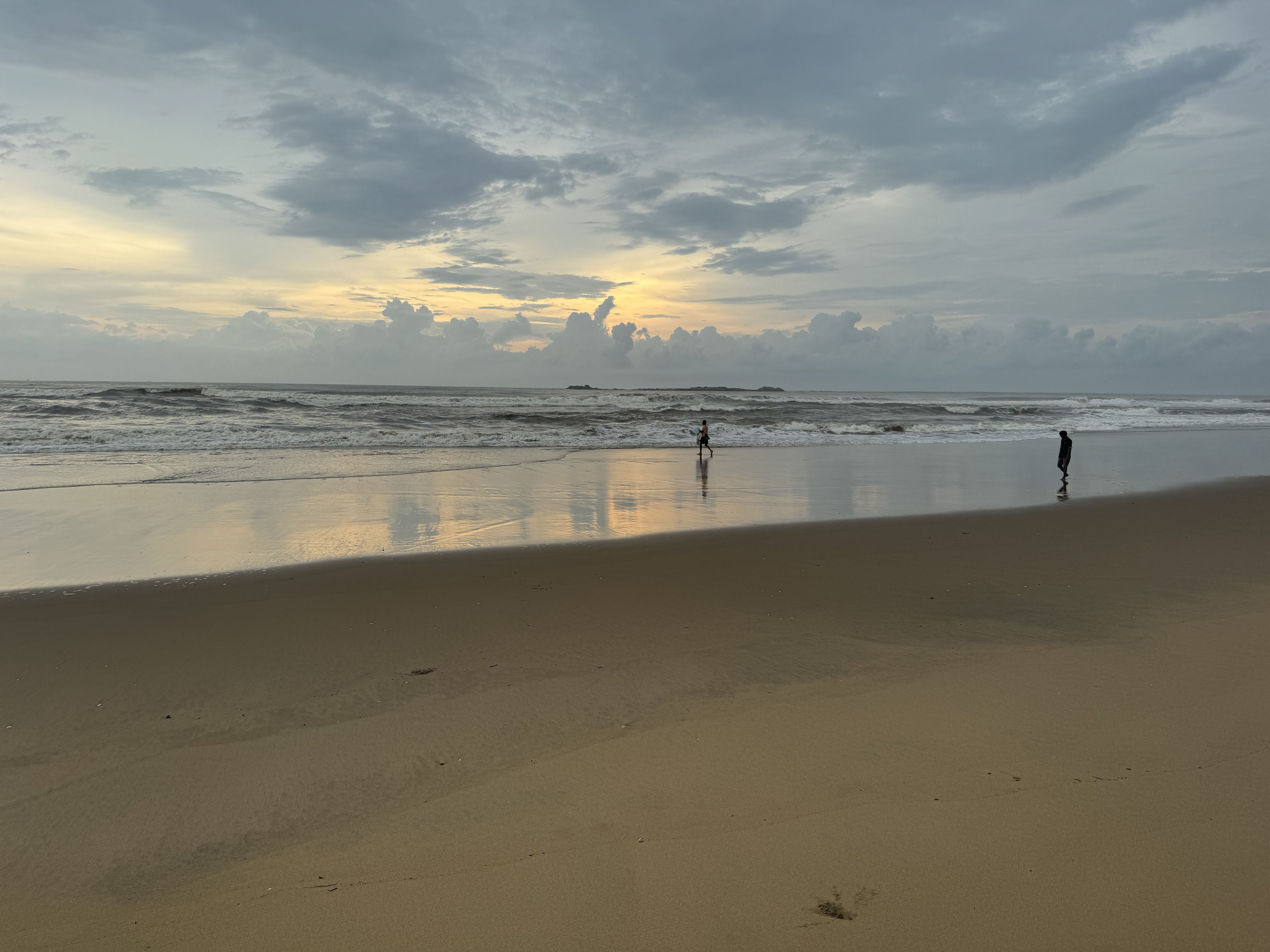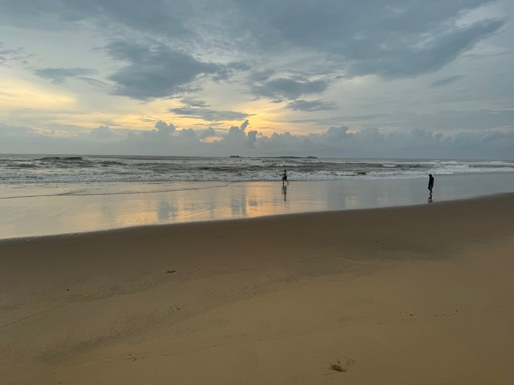 सूर्यास्त होता होता का होईना पण त्या ढगांच्या मागे लपंडाव खेळणाऱ्या सूर्यनारायणाने काही क्षण का होईना निरोपाचे दर्शन दिले खरे. आकाशात संध्यारंग पसरू लागले होते तीच रंगसंगती समोर ओहोटीच्या लाटांवरही उमटत होती. विस्तीर्ण आकाश आणि प्रचंड मोठा समुद्रकिनारा यांच्यासमोर तिथं वावरणारी माणसं शुल्क ठिपक्यासारखी वाटत होती