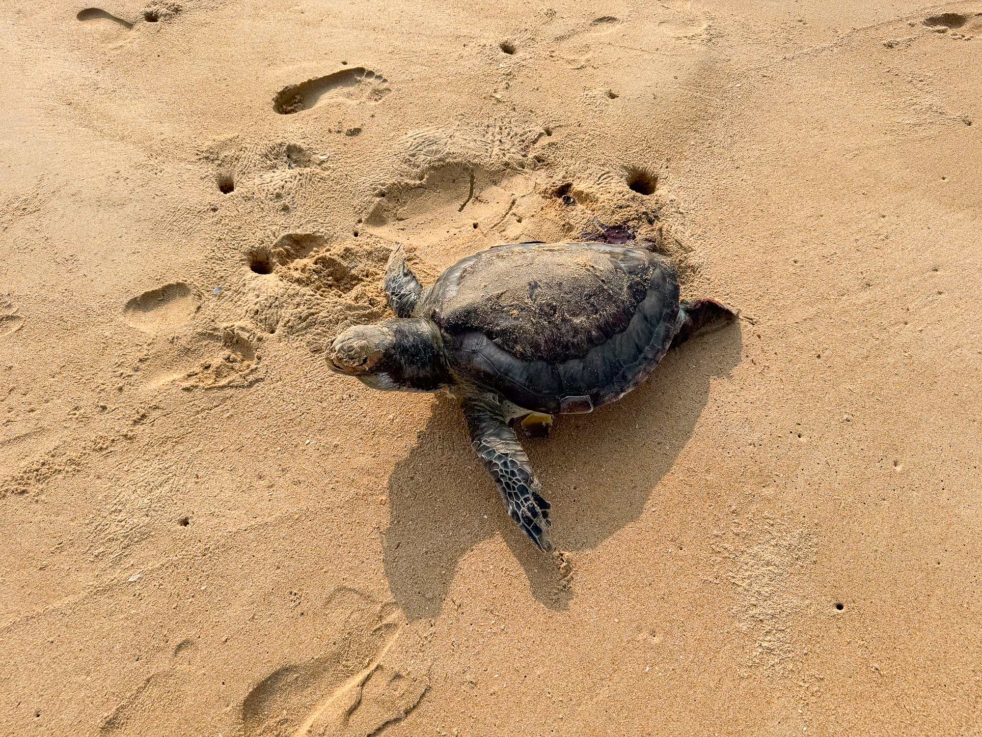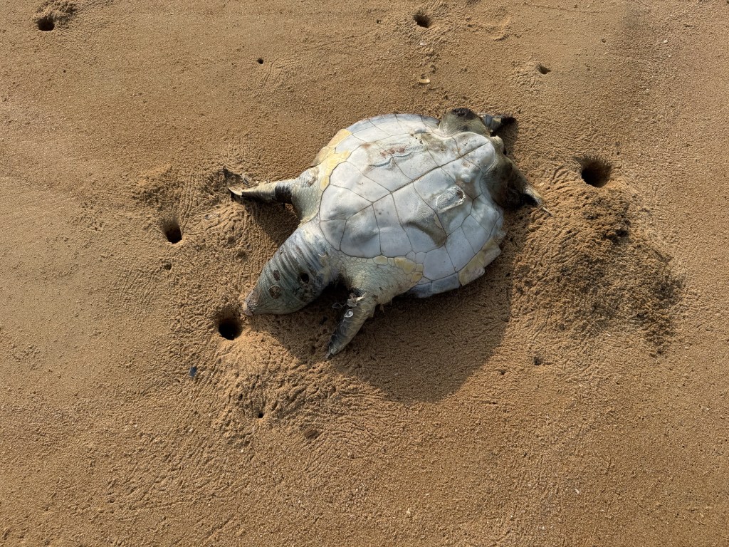 परतीच्या वाटेवर मी पाण्यापासून थोडे दूर येऊन मी काय पडले आहे ते पाहिले… एक मोठे कासव मारून पडलेले दिसले. या क्षेत्रात काम करणाऱ्या मोहन उपाध्येंना फोटो पाठवला आणि ते ऑलिव्ह रिडले आहे का विचारले. त्यांच्या मते हे ग्रीन टर्टल असावे. हिरव्या कासव (Green Turtles) हे समुद्रातील मोठ्या आकाराचे कासव आहेत, ज्यांचे शास्त्रीय नाव Chelonia mydas आहे. हे कासव समुद्राच्या उष्णकटिबंधीय आणि उपोष्णकटिबंधीय भागांमध्ये आढळतात. हिरव्या कासवांचे वजन साधारणपणे ११०-१५० किलोग्रॅम (२४०-३३० पाउंड) असू शकते, आणि त्यांची लांबी १ मीटरपर्यंत (३.३ फूट) पोहोचू शकते. त्यांच्या आहारामध्ये मुख्यत: समुद्री गवत, मासे आणि इतर जलचर वनस्पतींचा समावेश होतो. त्यांच्या हाडांचे जाड आवरण असते, ज्यामुळे ते जलद पोहण्यास सक्षम असतात.