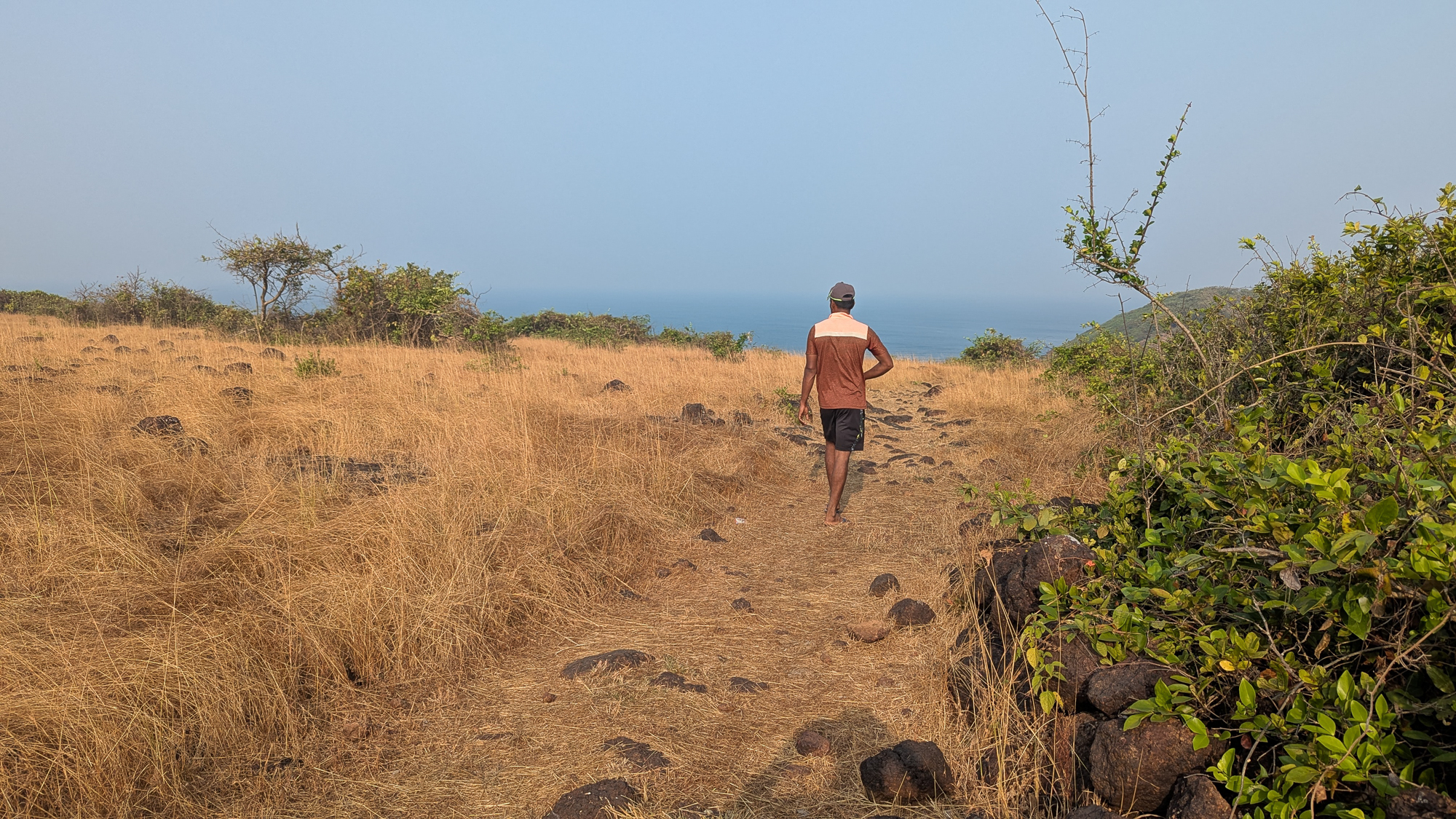 उन्हाची तिरीप अजून जाणवत नव्हती आणि वाऱ्याची झुळूक थंडावा देत असल्याने चालताना प्रसन्न वाटत होते. दीपगृहाकडे जाणारा रस्ता डाव्या बाजूला सोडून आम्ही एका वाय जंक्शन वरून काहीसे वायव्य दिशेने निघालो. सुमारे पन्नास मीटर उंच सड्यावरून उतरून आम्हाला समुद्र सपाटीला जायचे होते. थोरला किंवा मोठा केउंडला इथं खाली होता.. धाकट्या केउंडल्याला जाणारा रस्ता लांबून जातो असे अक्षय म्हणाला. मला मात्र वाटले की भरती नसल्याने कदाचित दक्षिण टोकाला दगडांच्या पलीकडे मार्ग काढत गेले तर किनाऱ्यावरूनच पलीकडे धाकट्या केउंडल्याला जाता येईल.