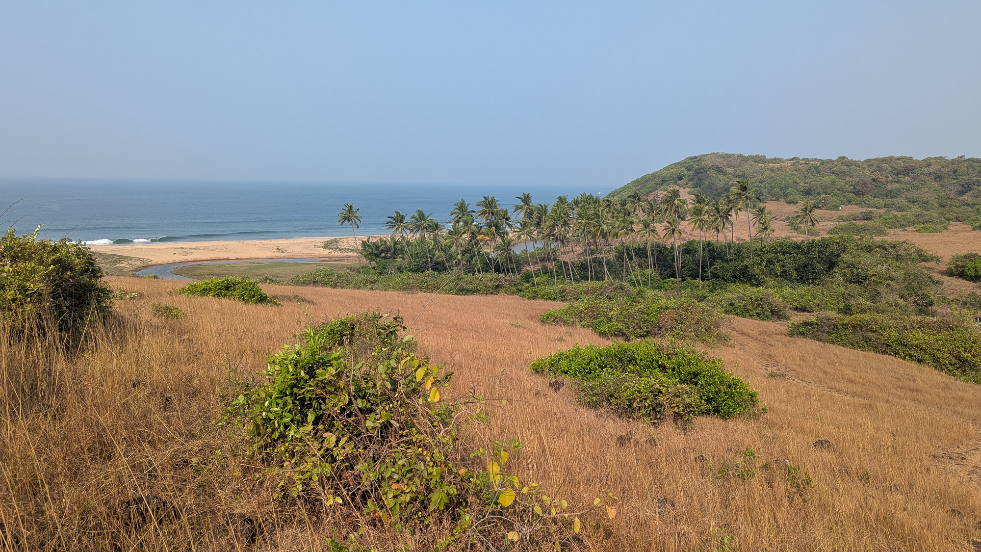 सडा ओलांडून टोकाजवळ आलो तेव्हा हलकासा उतार लागला होता. समुद्राची गाज आता ऐकू येऊ लागली होती.. भरती नव्हती तेव्हा गर्जनेचा सूर न लावता सागराची सौम्य आवर्तने सुरूच होती.. वाऱ्याचा गारवाही आता तुलनेने जास्त जाणवत होता.. झुडुपांची एक जाळी ओलांडली आणि समोर किनाऱ्याचे पहिले दर्शन झाले. उजवीकडे माडांची एक रांग होती आणि तिच्या बाजूने समुद्राच्या दिशेने गेलेला एक छोटा ओहोळ किंवा छोटी खाडी दिसत होती.. या खडकाळ आणि गवताळ भागातून उतरत आम्ही केउंडला किनाऱ्याच्या पुळणीवर उतरणार होतो.